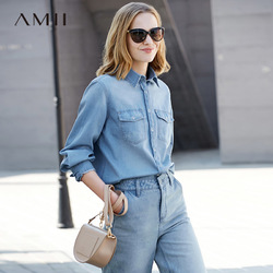Amii极简chic休闲宽松牛仔衬衫中长款2018春上衣原宿polo衫女长袖