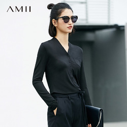 amii极简港味复古T恤女2018春装新款修身v领长袖纽扣莫代尔打底衫