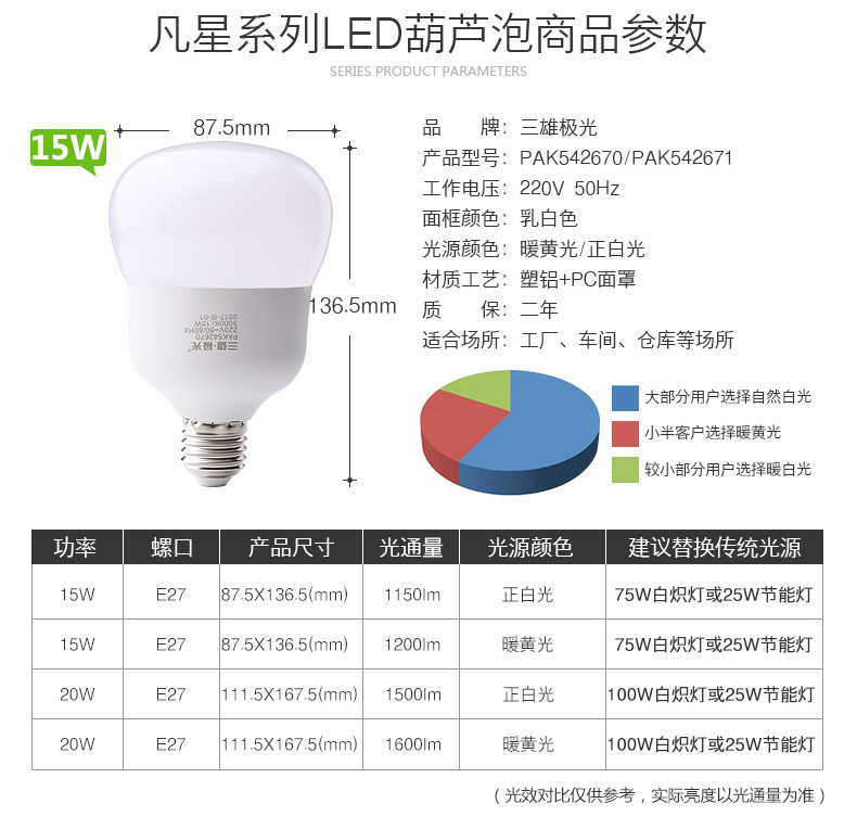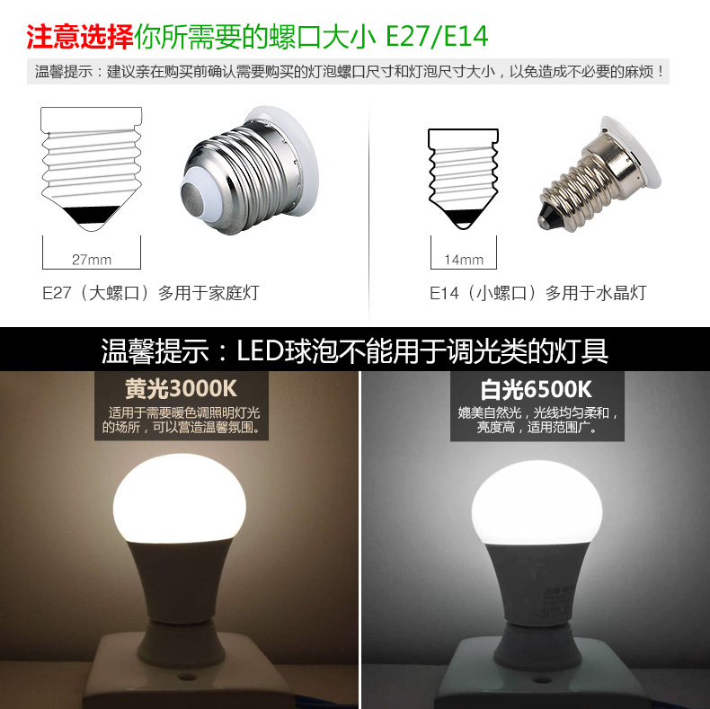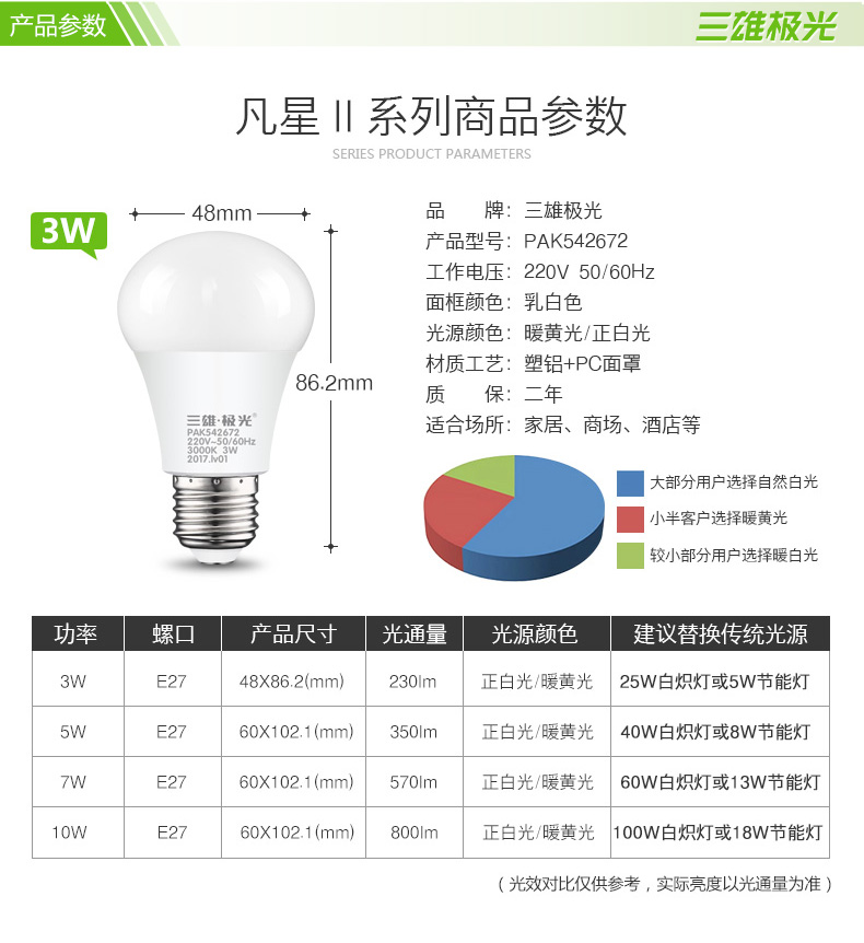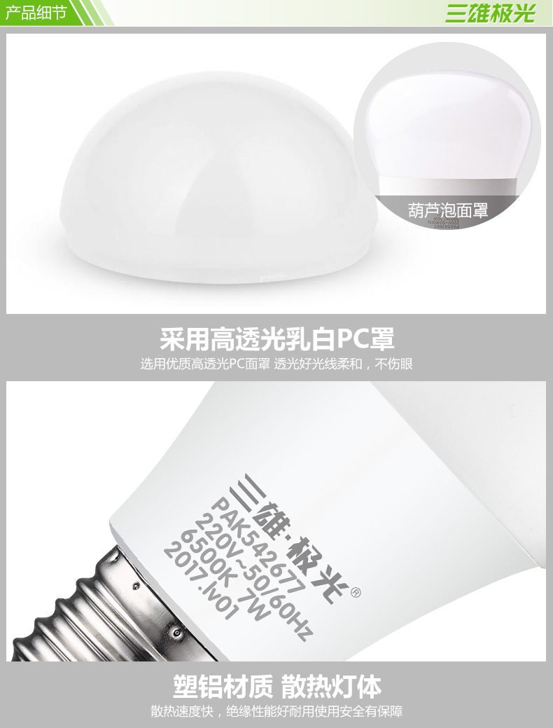 三雄极光 球泡led灯泡E27螺口暖白节能灯泡5w球泡灯lamp光源超亮