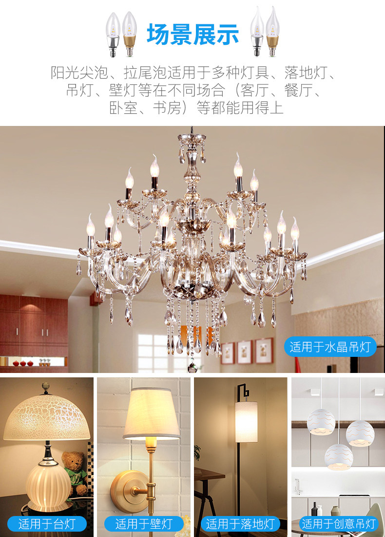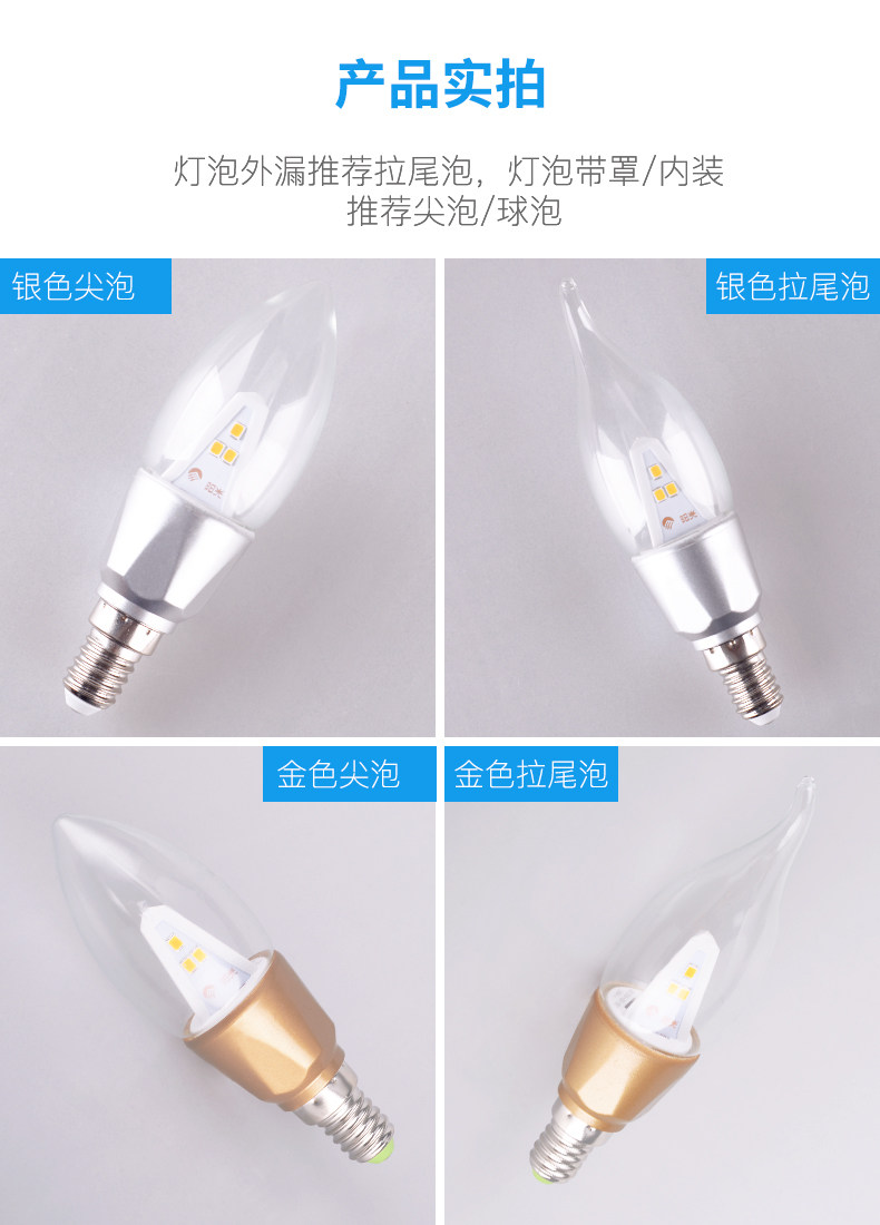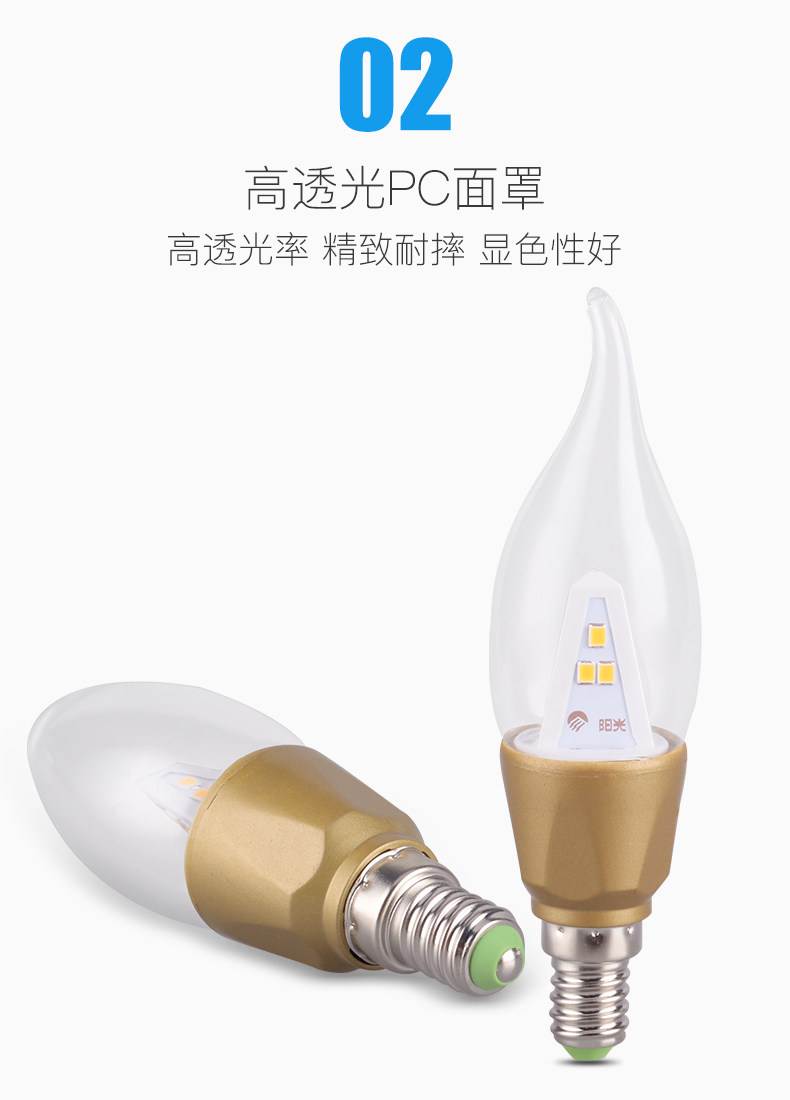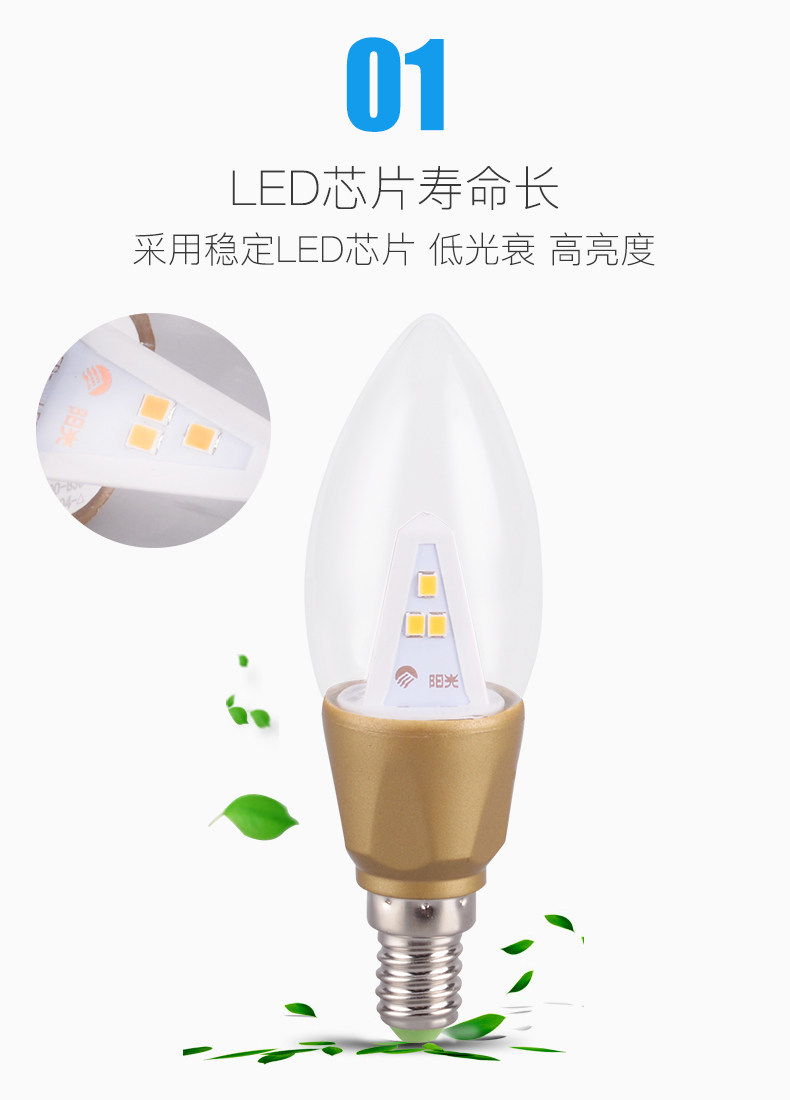 阳光LED尖泡拉尾蜡烛灯泡E14螺口3W吊灯暖白黄照明超亮节能光源
