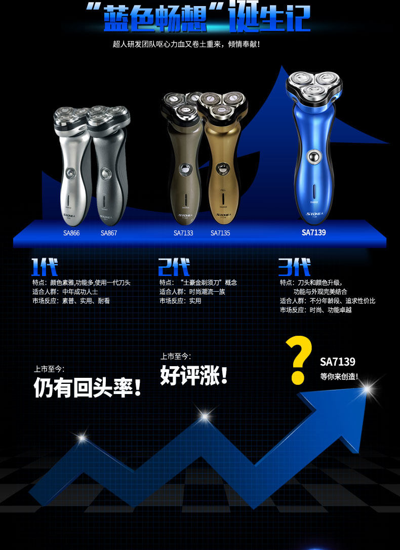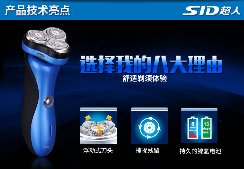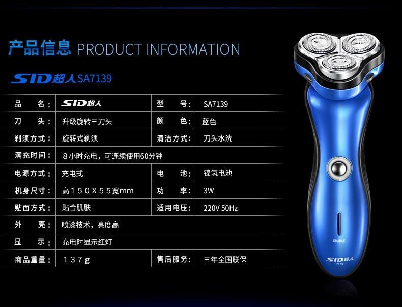 以下是SA7139超人三头旋转式电动剃须刀超人充电式刮胡刀刀头水洗须刨的详细说明,厂家介绍,求购联系信息,最终解释权归超人集团有限公司所有