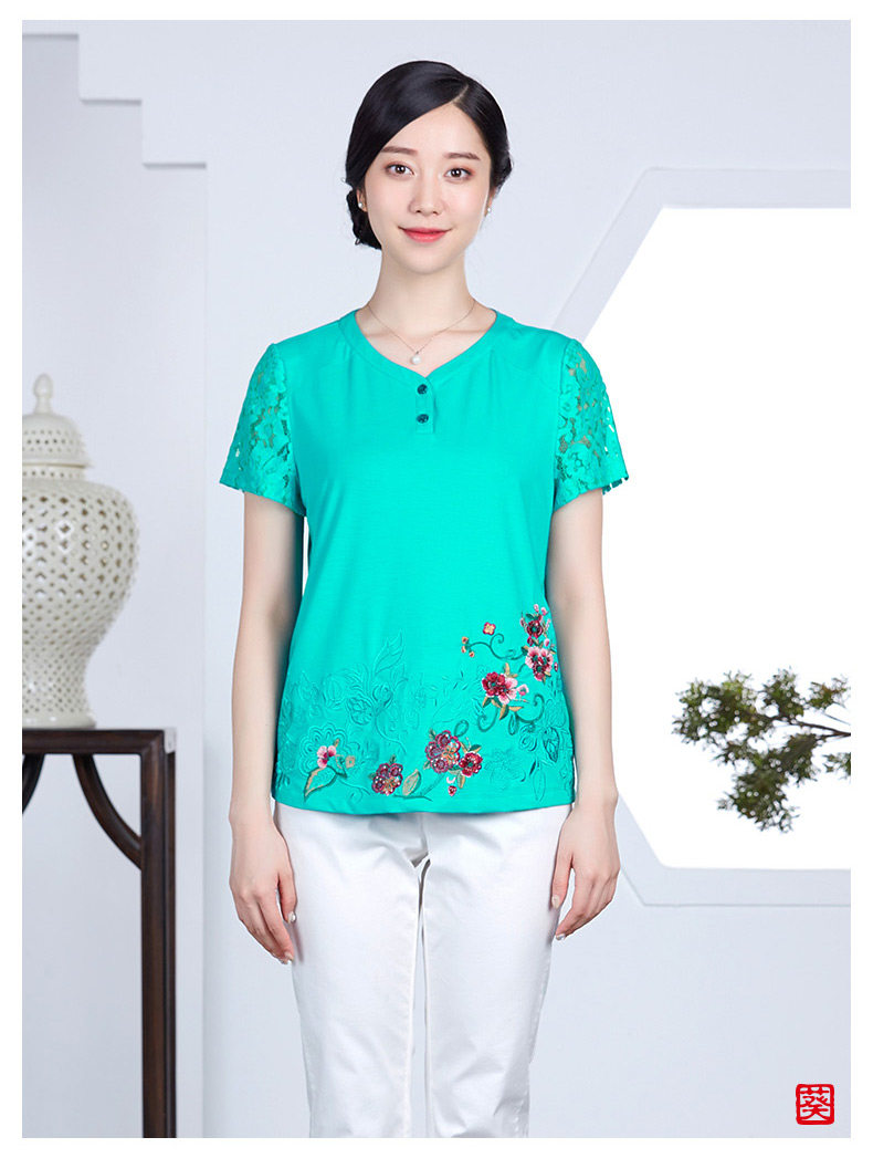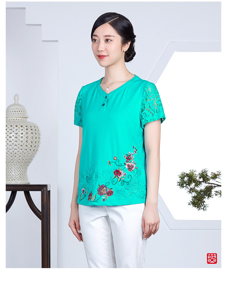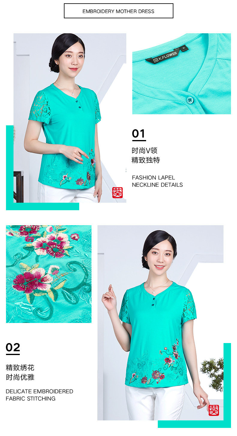 以下是葵牌2018新款t恤女短袖绣花妈妈装夏装中老年女装民族风大码上衣的详细说明,厂家介绍,求购联系信息,最终解释权归深圳市葵牌服饰有限公司所有