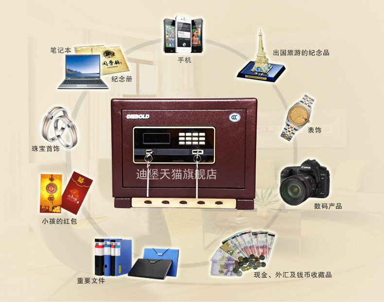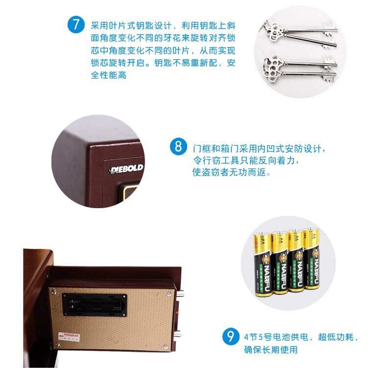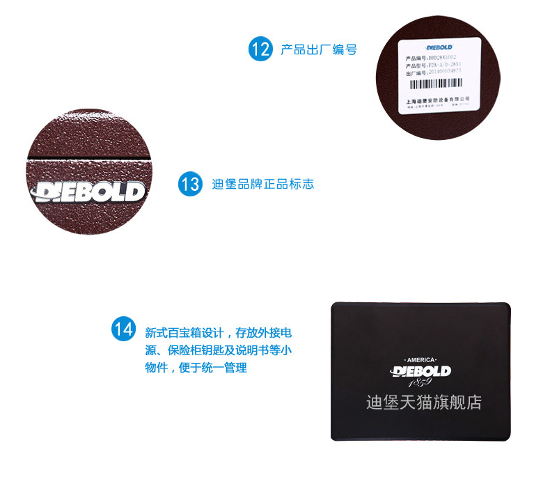 4、 新式百宝箱设计,存放保险柜钥匙及说明书等小物件,便于统一管理;