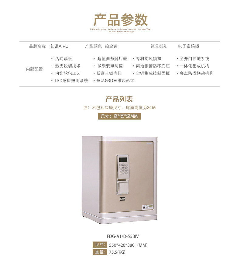 AIPU艾谱保险柜家用WiFi入墙办公保险箱铂金55B 65B 75B 85B 95B