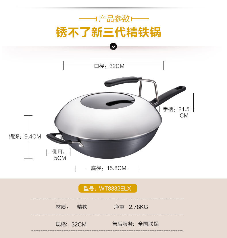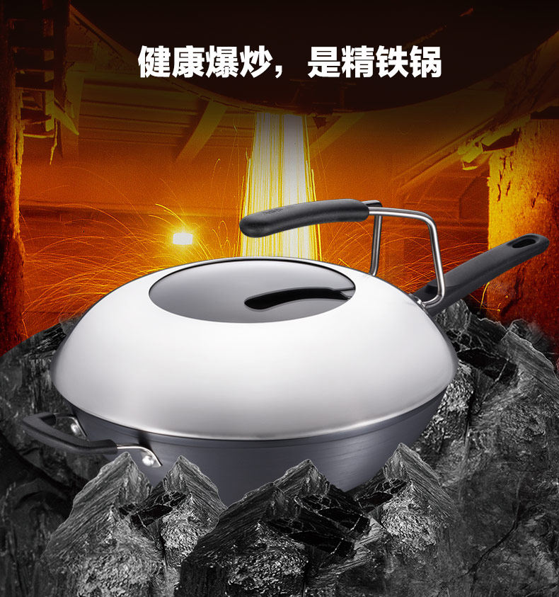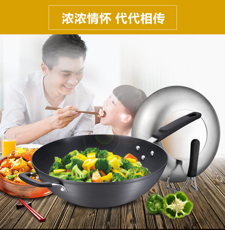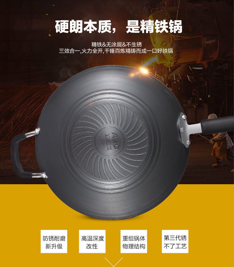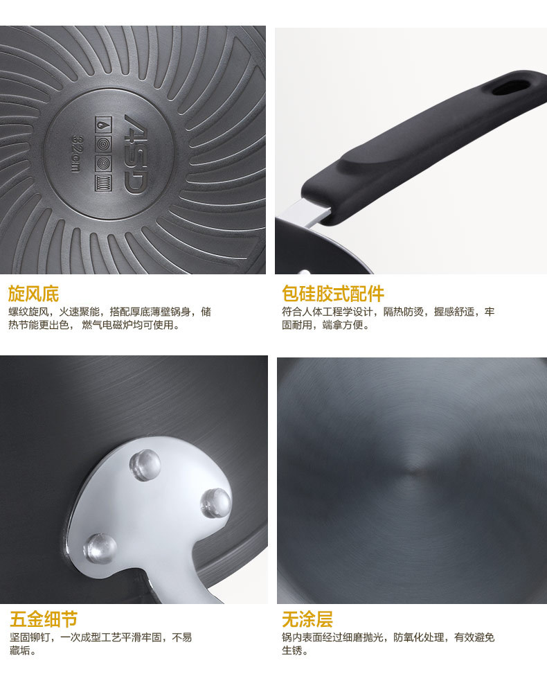 爱仕达32cm锈不了炒菜炒锅耐用旋风无涂层精铁锅燃气电磁炉通用