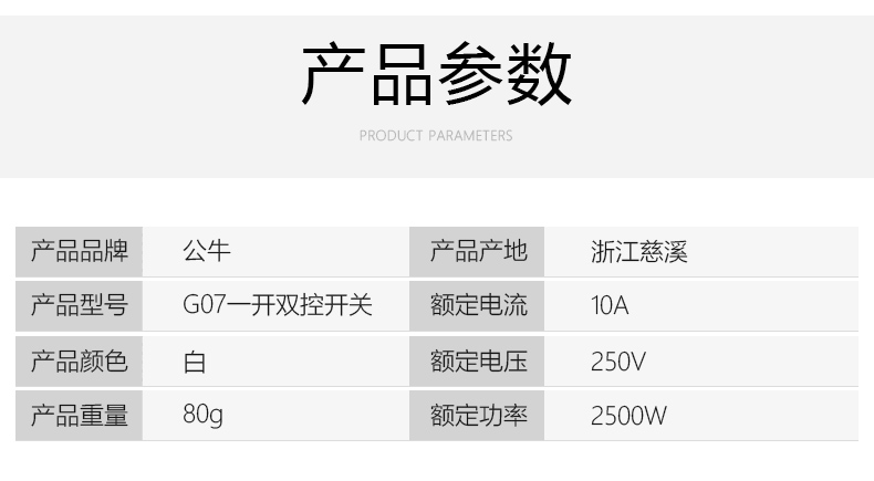 以下是公牛开关插座单开双控开关1开一开双控开关一位一联双控面板G07的详细说明,厂家介绍,求购联系信息,最终解释权归公牛集团有限公司所有