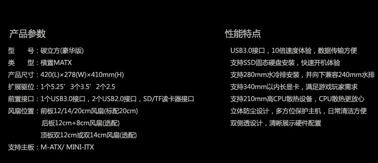 【温馨提示】碳立方机箱只支持Micro ATX及ITX主板(统称小板); 不支持ATX主板(大板),请您选购时确认主板是否支持,以免对您造成不必要的困扰。如有疑问请咨询在线客服!因个人原因,非质量问题退换货的邮费由买家承担,谢谢~!
