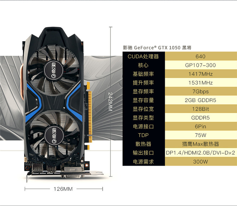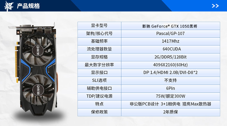 影驰 GTX1050 黑将 2G 128Bit 独立游戏显卡 非GTX750TI 1060显卡