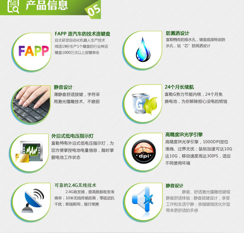 富勒MK850键盘鼠标均静音,无声的力量。键盘纤薄静音舒适,带2颗免驱音量快捷键。鼠标静音,且采用IR无光引擎,鼠标底部不发光。按键无声,握感舒适,定位灵敏,节能设计,12个月免换电池,胜任商务办公,家庭娱乐所用。