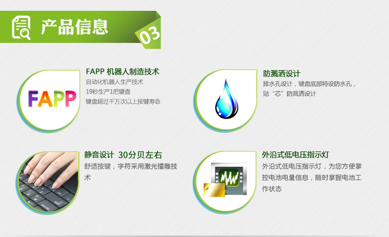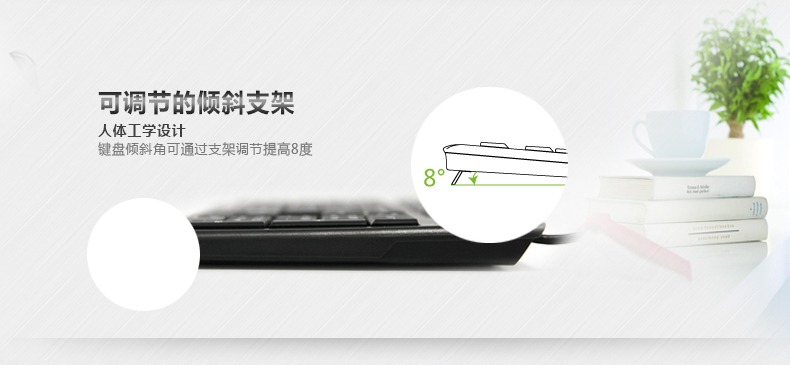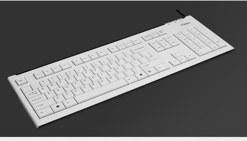 Fuhlen(富勒)L400键盘厚处才14mm,整体纤薄,另外键盘按键采用静音设计,按键手感舒适,键帽为低扁平设计,类似于笔记本键帽手感,长时间使用也不易疲劳,按键布局仍为标准键盘布局。Fuhlen(富勒)L400键盘其连接线在键盘右上角,而普通键盘均设计在中间,这样的布置比较容易打理桌面线材。其接口方式为USB,即插即用。