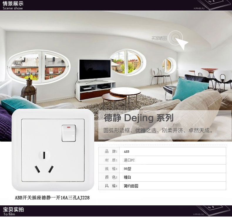 ABB开关插座面板ABB开关插座德静 一位/16A三孔空调带开关AJ228