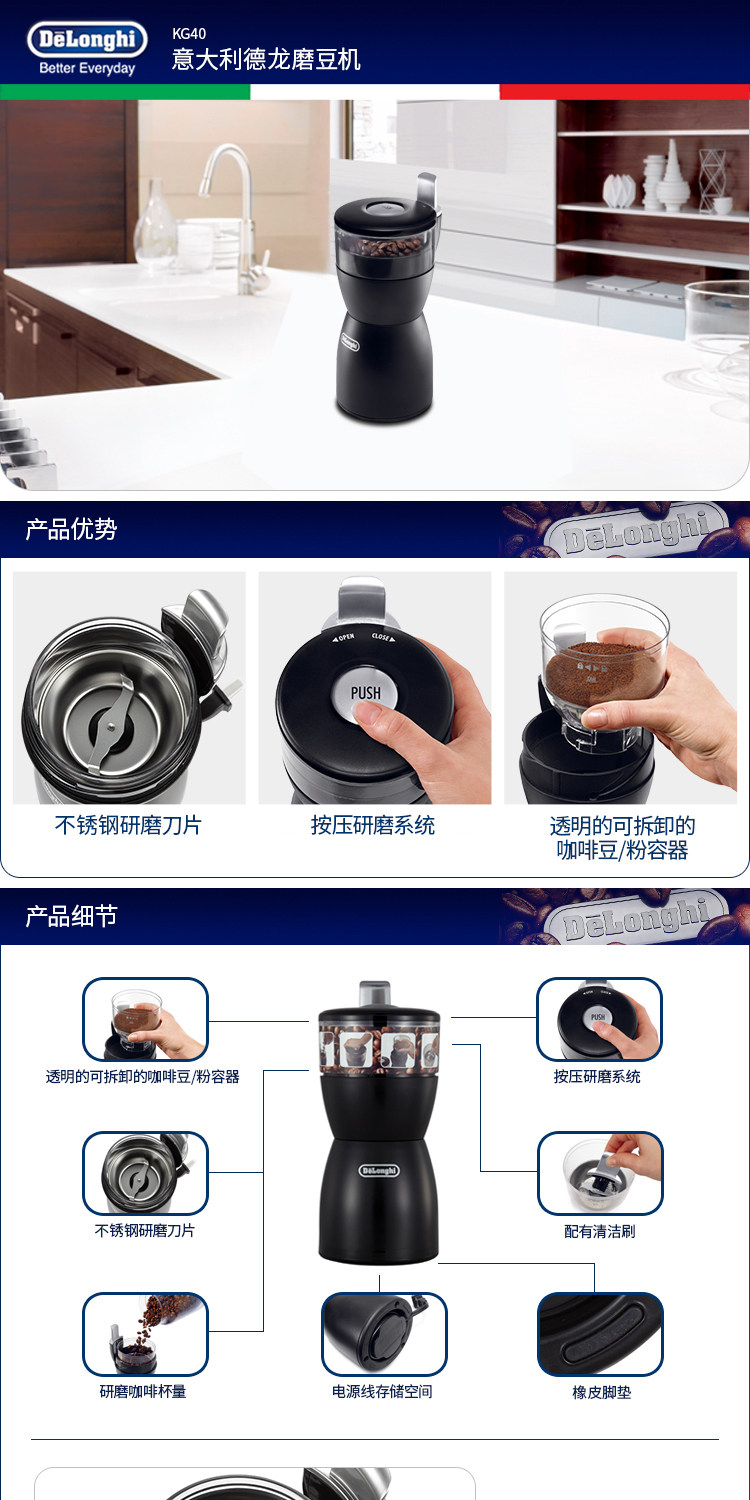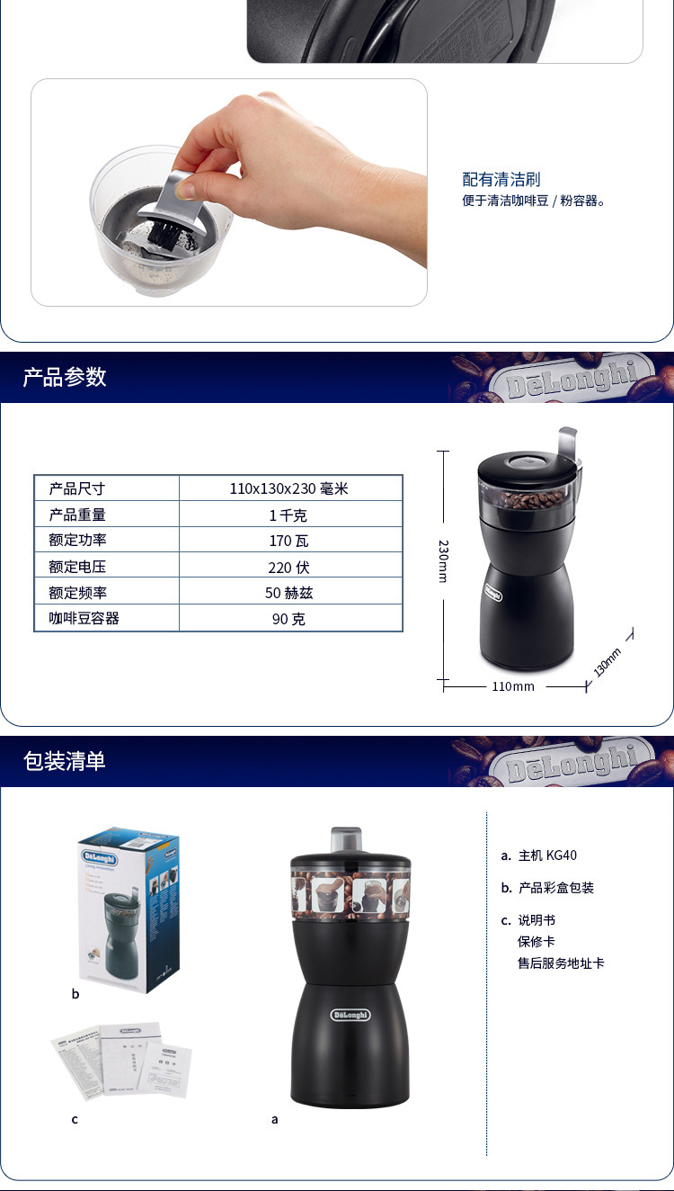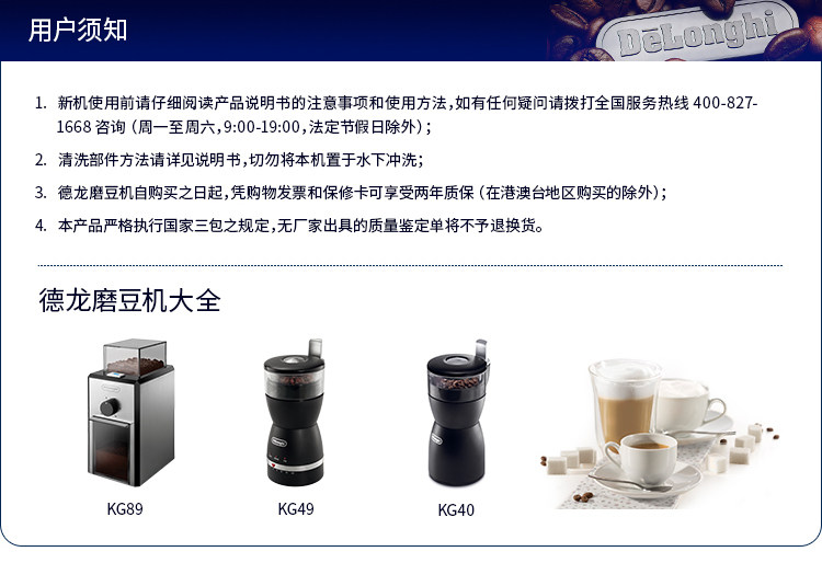 Delonghi/德龙 KG49 家用咖啡豆研磨机磨豆机电动可调节研磨粗细