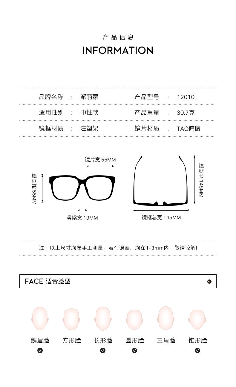 派丽蒙太阳镜女墨镜女眼镜方框男士偏光太阳镜男墨镜女开车12010