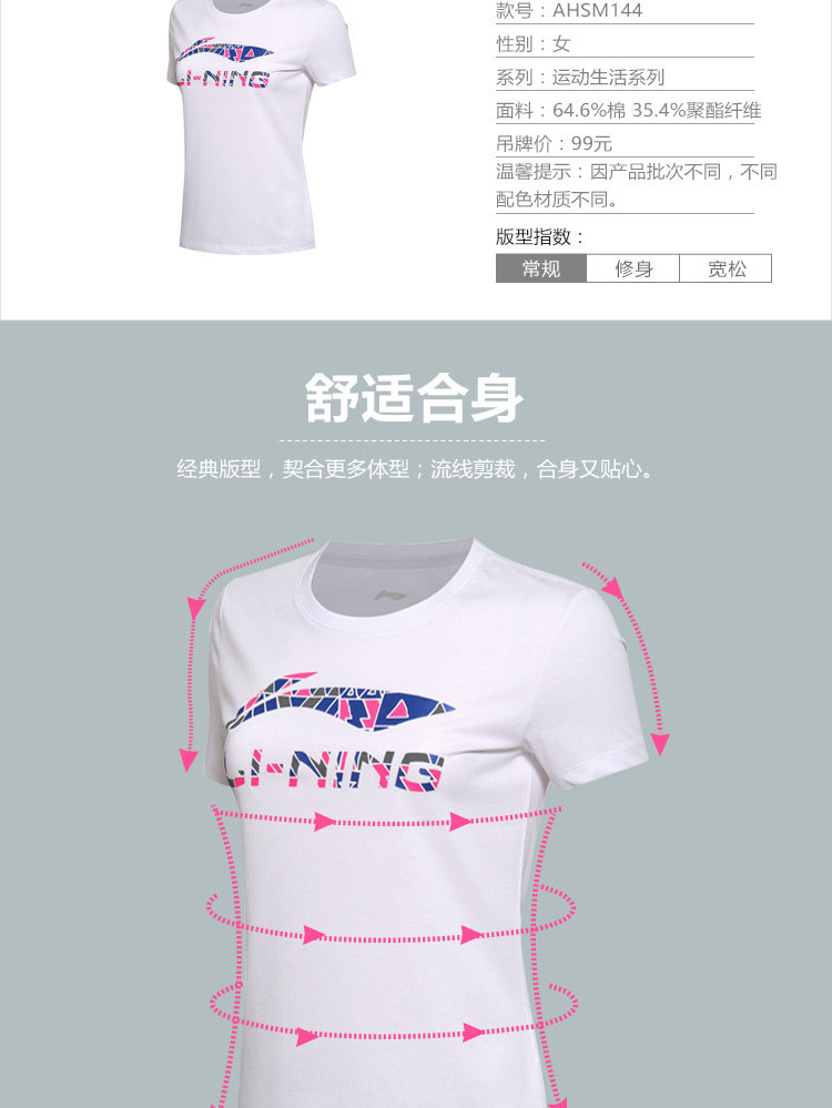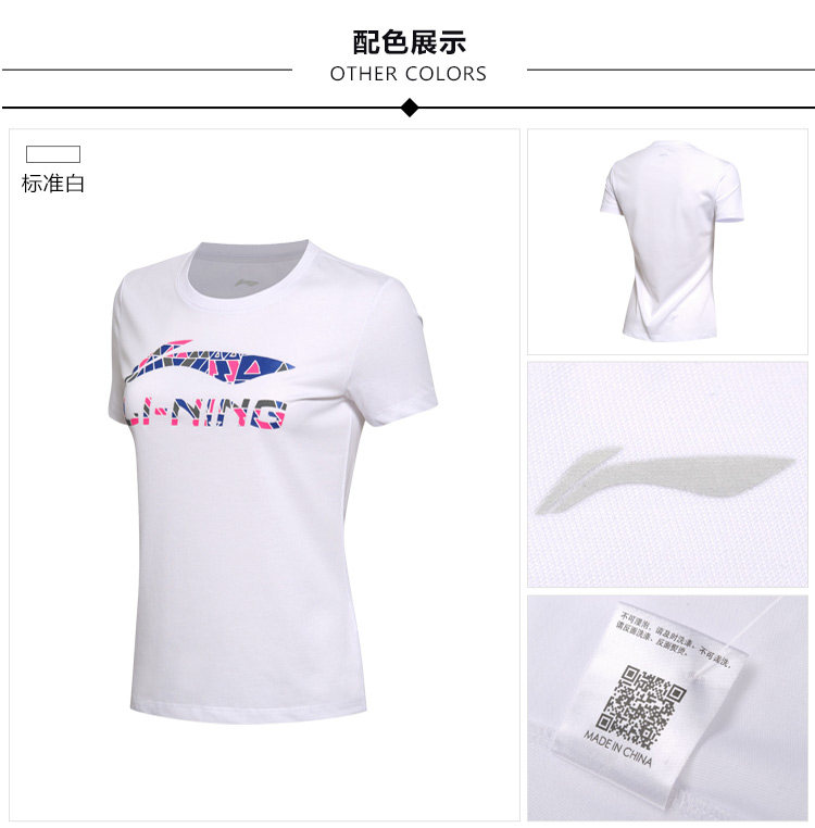 以下是李宁短袖T恤女士新款运动生活系列圆领潮流针织短装夏季运动服的详细说明,厂家介绍,求购联系信息,最终解释权归李宁(中国)体育用品有限公司所有