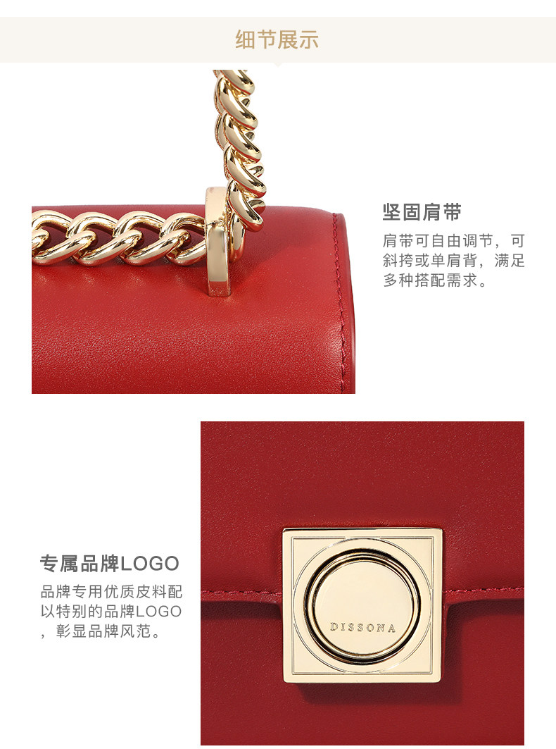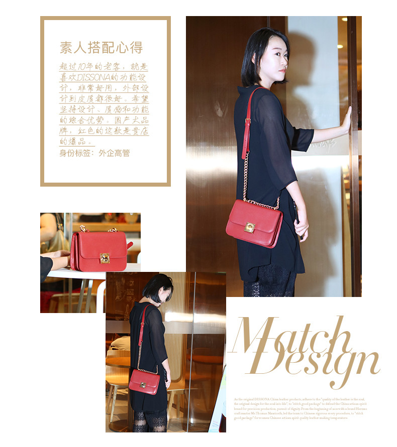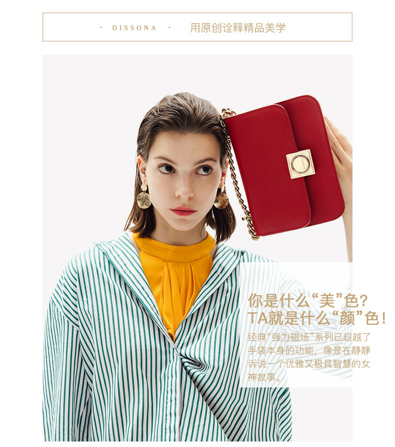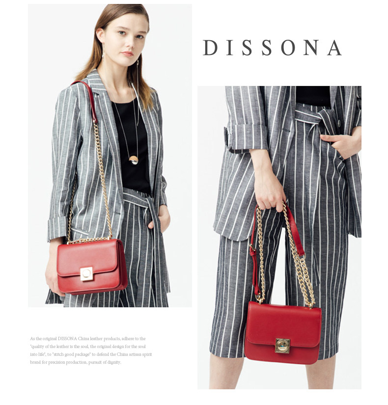 DISSONA坚持“最优质的皮料是灵魂”,每一块精选的上乘皮料,都经过多重繁复的步骤处理,融合奢华精品的设计信仰以及匠师独一无二的手工,为新时代的女性创造出高雅精致的皮具精品,诠释她们心中华美而坚韧的梦想,经过时间的沉淀,她带给人们的不仅是优质生活的享受,更是永恒追求美好的精神启发。