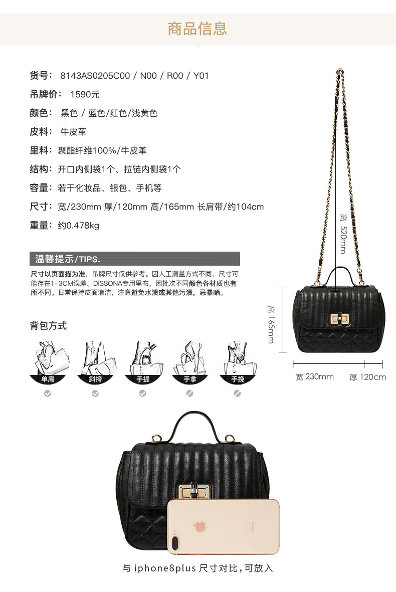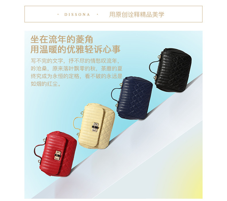 DISSONA坚持“最优质的皮料是灵魂”,每一块精选的上乘皮料,都经过多重繁复的步骤处理,融合奢华精品的设计信仰以及匠师独一无二的手工,为新时代的女性创造出高雅精致的皮具精品,诠释她们心中华美而坚韧的梦想,经过时间的沉淀,她带给人们的不仅是优质生活的享受,更是永恒追求美好的精神启发。