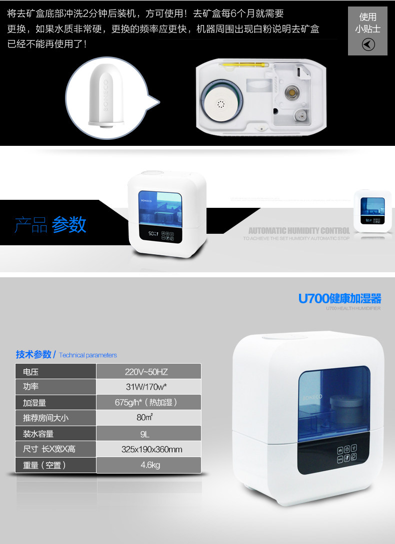 瑞士风/BONECO博瑞客加湿器家用静音卧室大容量办公室香薰U200