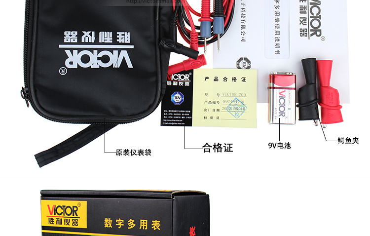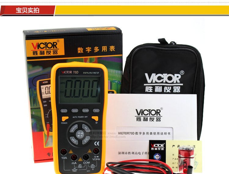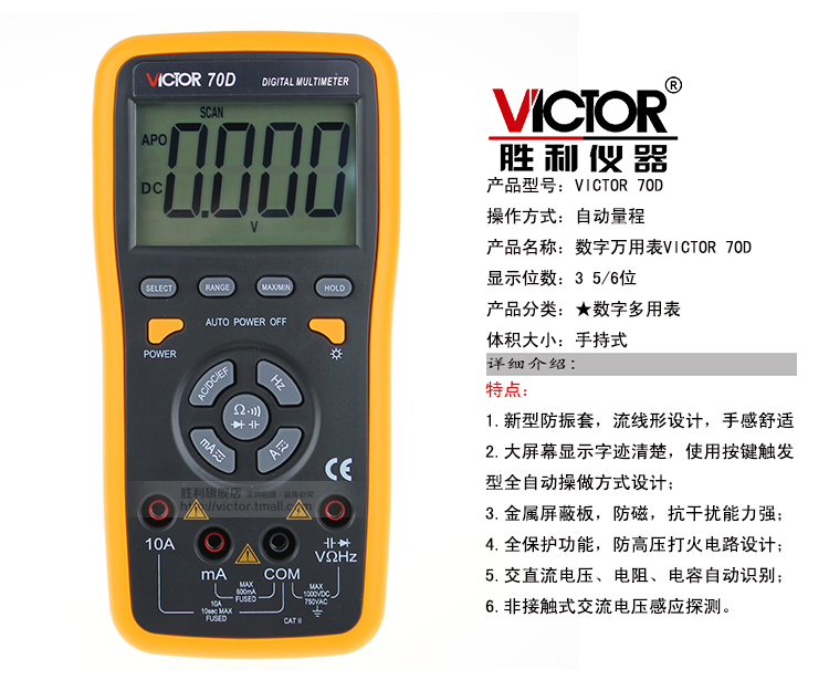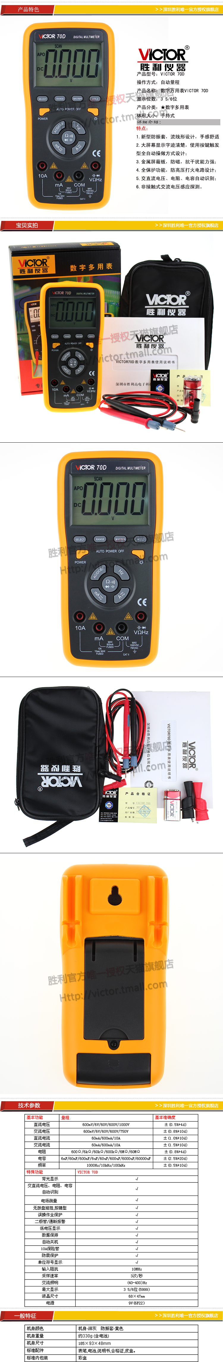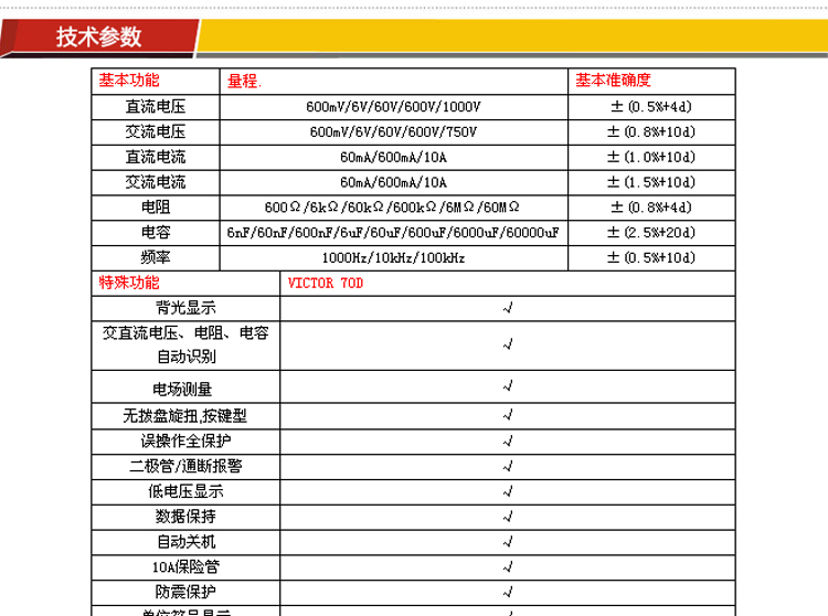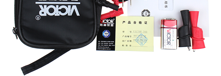 特点: 1、 新型防振套,流线形设计,手感舒适; 2、 大屏幕显示字迹清楚,使用按键触发型全自动操做方式设计; 3、 金属屏蔽板,防磁,抗干扰能力强; 4、 全保护功能,防高压打火电路设计; 5、 交直流电压、电阻、电容自动识别; 6、 非接触式交流电压感应探测。 基本功能 | 量程. | 基本准确度 | 直流电压 | 600mV/6V/60V/600V/1000V | ±(0.5%+4d) | 交流电压 | 600mV/6V/60V/600V/750V | ±(0.8%+10d) | 直流电流 | 60mA/600mA/10A | ±(1.0%+10d) | 交流电流 | 60mA/600mA/10A | ±(1.5%+10d) | 电阻 | 600Ω/6kΩ/60kΩ/600kΩ/6MΩ/60MΩ | ±(0.8%+4d) | 电容 | 6nF/60nF/600nF/6uF/60uF/600uF/6000uF/60000uF | ±(2.5%+20d) | 频率 | 1000Hz/10kHz/100kHz | ±(0.5%+10d) | 特殊功能 | VICTOR 70D | 背光显示 | √ | 交直流电压、电阻、电容自动识别 | √ | 电场测量 | √ | 无拨盘旋扭,按键型 | √ | 误操作全保护 | √ | 二极管/通断报警 | √ | 低电压显示 | √ | 数据保持 | √ | 自动关机 | √ | 10A保险管 | √ | 防震保护 | √ | 单位符号显示 | √ | 输入阻抗 | 10MHz | 采样速率 | 3次/秒 | 交流频响 | (40-400)Hz | 最大显示 | 3 5/6位(5999) | 液晶尺寸 | 68×47mm | 电源 | 9V(6F22) | | | | | |