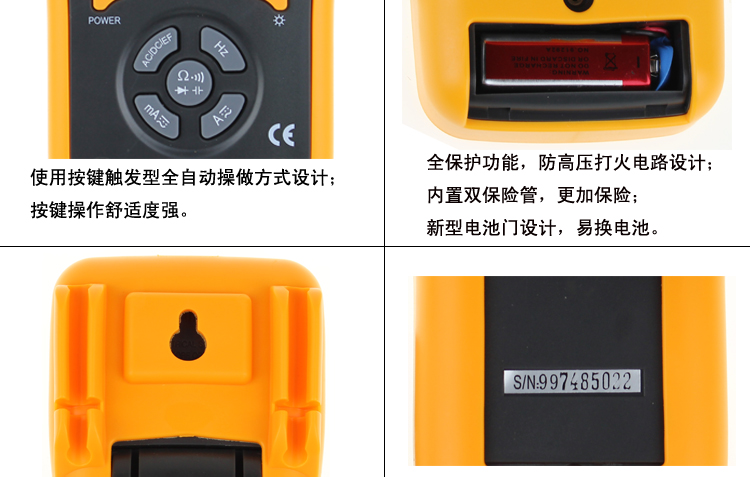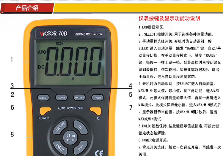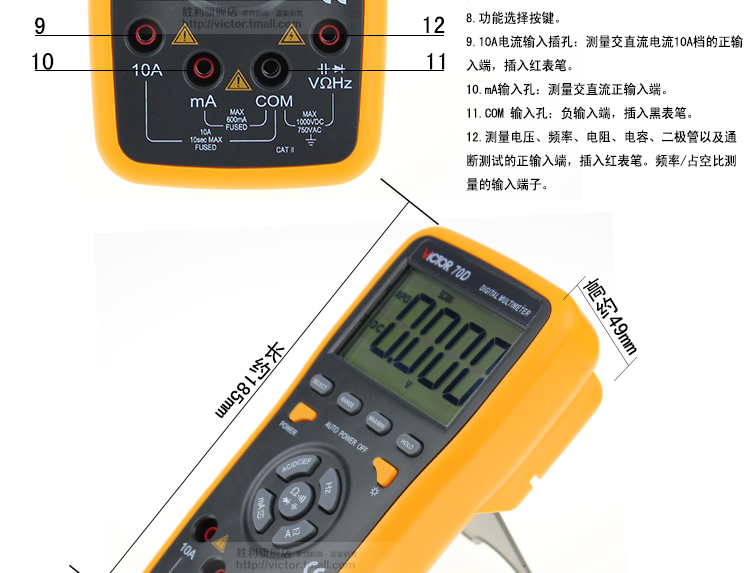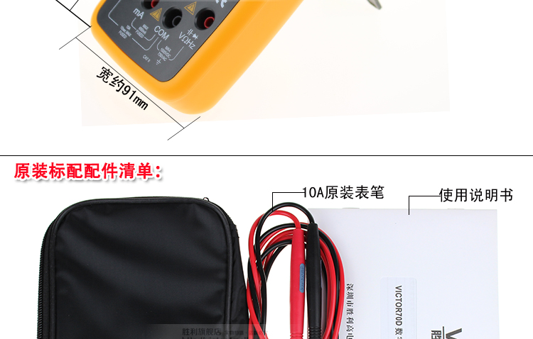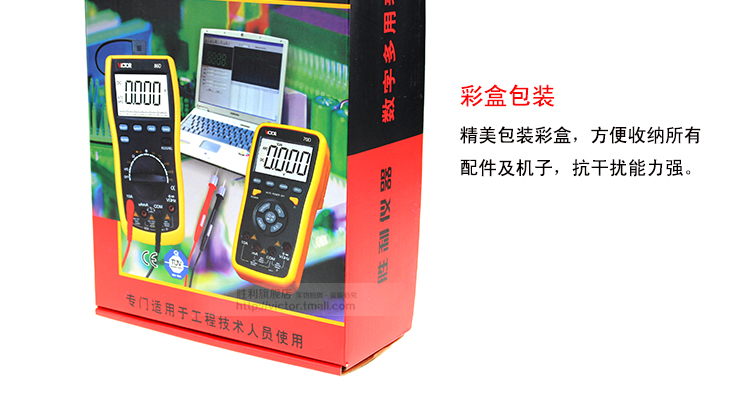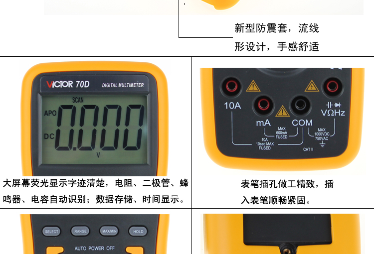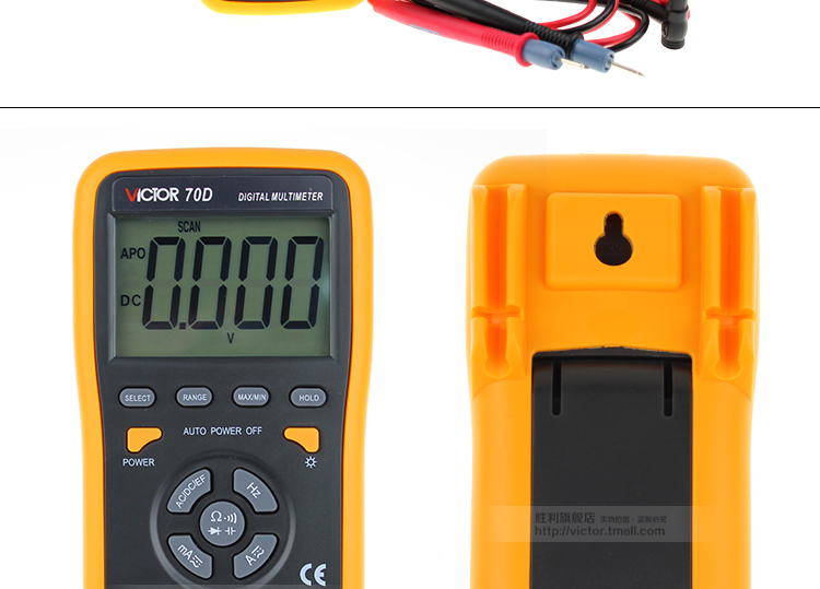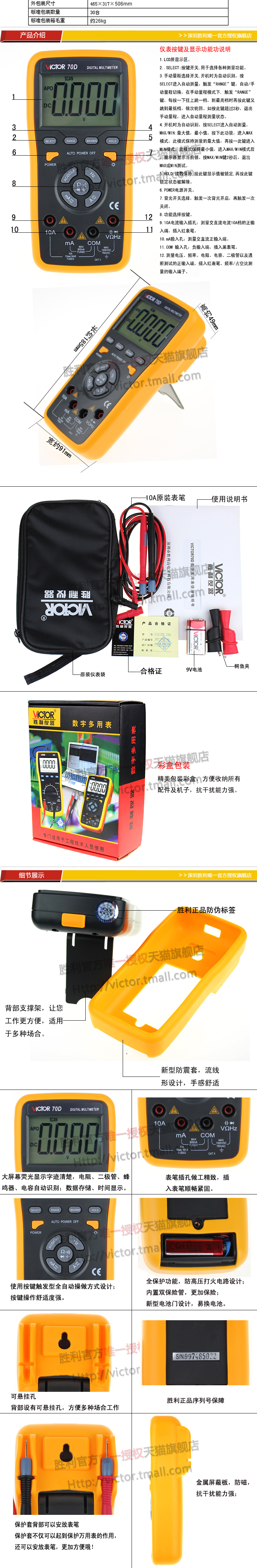 特点: 1、 新型防振套,流线形设计,手感舒适; 2、 大屏幕显示字迹清楚,使用按键触发型全自动操做方式设计; 3、 金属屏蔽板,防磁,抗干扰能力强; 4、 全保护功能,防高压打火电路设计; 5、 交直流电压、电阻、电容自动识别; 6、 非接触式交流电压感应探测。 基本功能 | 量程. | 基本准确度 | 直流电压 | 600mV/6V/60V/600V/1000V | ±(0.5%+4d) | 交流电压 | 600mV/6V/60V/600V/750V | ±(0.8%+10d) | 直流电流 | 60mA/600mA/10A | ±(1.0%+10d) | 交流电流 | 60mA/600mA/10A | ±(1.5%+10d) | 电阻 | 600Ω/6kΩ/60kΩ/600kΩ/6MΩ/60MΩ | ±(0.8%+4d) | 电容 | 6nF/60nF/600nF/6uF/60uF/600uF/6000uF/60000uF | ±(2.5%+20d) | 频率 | 1000Hz/10kHz/100kHz | ±(0.5%+10d) | 特殊功能 | VICTOR 70D | 背光显示 | √ | 交直流电压、电阻、电容自动识别 | √ | 电场测量 | √ | 无拨盘旋扭,按键型 | √ | 误操作全保护 | √ | 二极管/通断报警 | √ | 低电压显示 | √ | 数据保持 | √ | 自动关机 | √ | 10A保险管 | √ | 防震保护 | √ | 单位符号显示 | √ | 输入阻抗 | 10MHz | 采样速率 | 3次/秒 | 交流频响 | (40-400)Hz | 最大显示 | 3 5/6位(5999) | 液晶尺寸 | 68×47mm | 电源 | 9V(6F22) | | | | | |