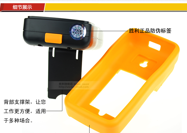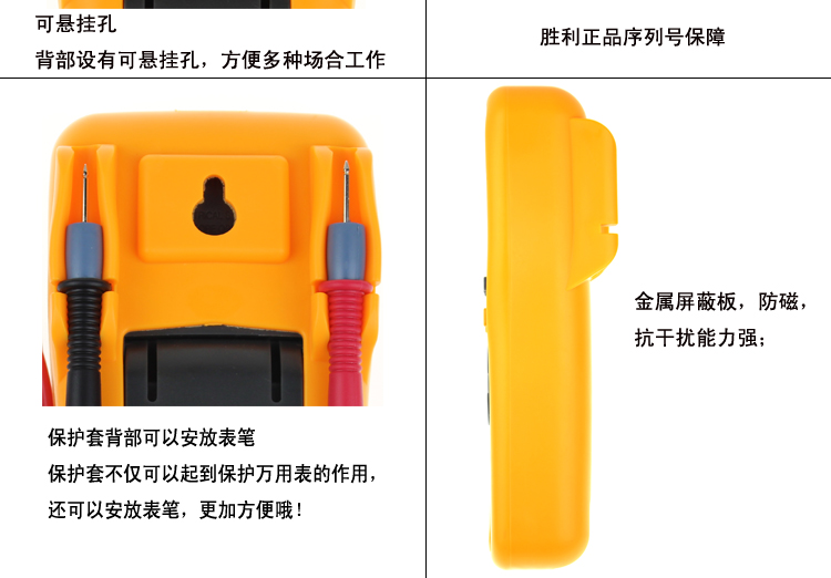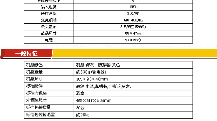 |一|般|特|征| 机身颜色 | 机身-深灰 防振套-黄色 | 机身重量 | 约330g (含电池) | 机身尺寸 | 185×93×48mm | 标准配件 | 表笔,电池,说明书,合格证,皮盒。 | 标准内包装 | 彩盒 | 外包装尺寸 | 465×317×506mm | 标准包装数量 | 30台 | 标准包装箱毛重 | 约26kg |