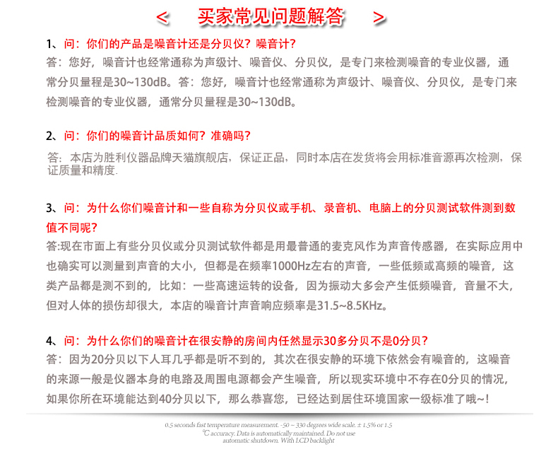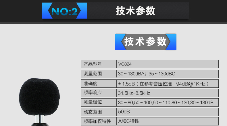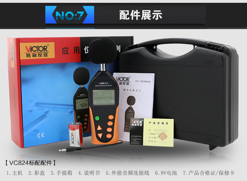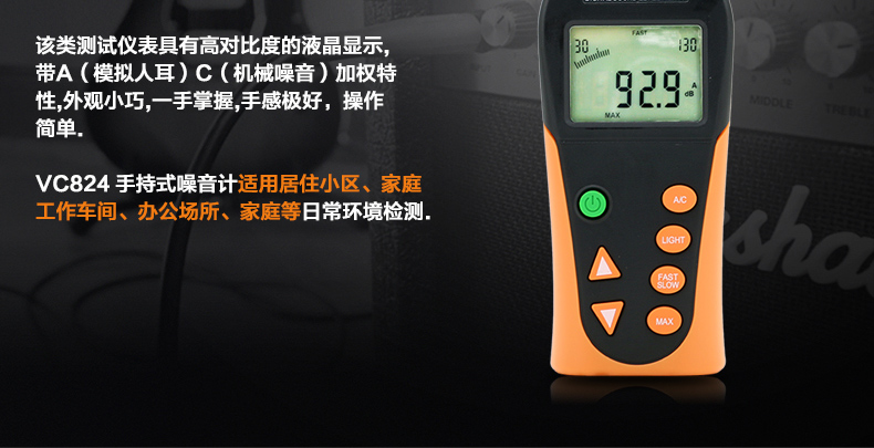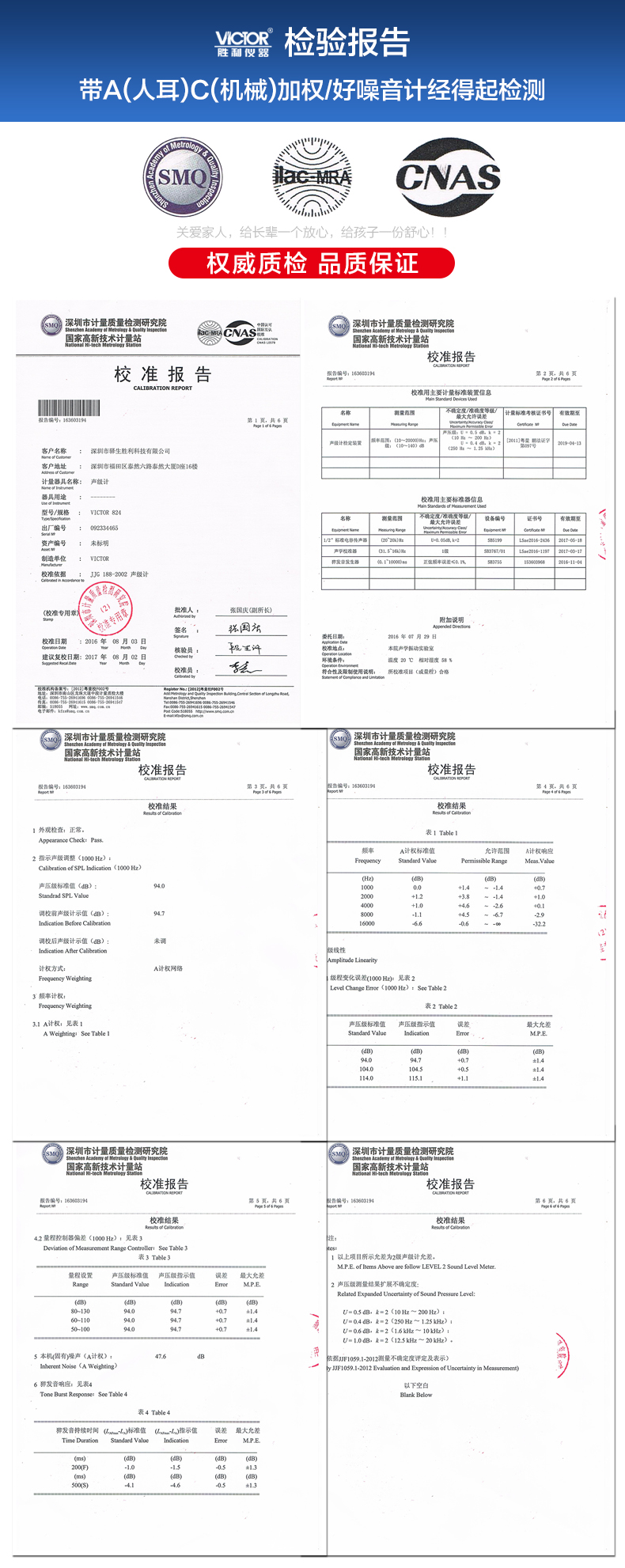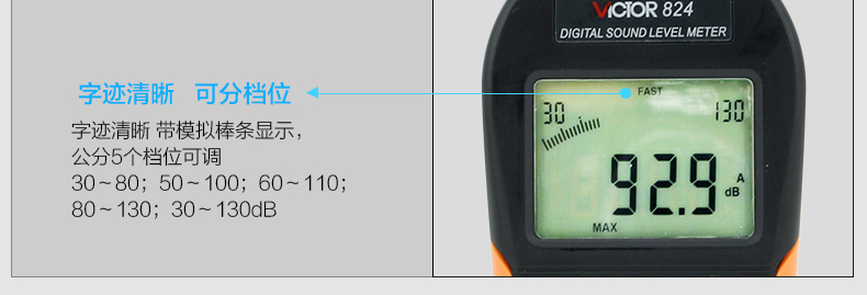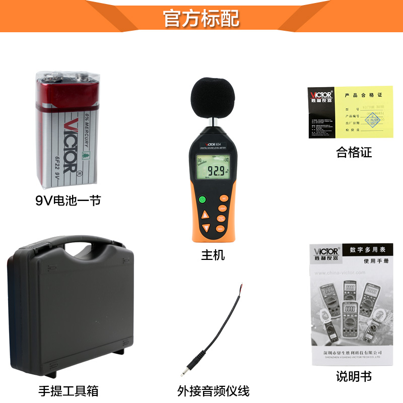 VICTOR 824 数字噪音计 测量范围 | 30~130dBA;35~130dBC | 准确度 | ±1.5dB(在参考音压位准,94dB@1KHz) | 频率响应 | 31.5Hz-8.5kHz | 测量档位 | 30~80,50~100,60~110,80~130,30~130dB | 动态范围 | 50dB/100dB | 频率加权特性 | A和C特性 | 数位显示 | 4位显示,解析度0.1dB,取样率为2次/秒 | 类比刻画显示 | 一刻画代表1dB,取样率为20次/秒 | 过载指示 | OVER/UNDER符号 | AC信号输出 | 0.707Vrms/每档满刻度,输出阻抗约600ohm | DC信号输出 | 10mV/dB,输出阻抗约100ohm | 动态特性 | FAST(快速),SLOW(慢速)之反应速率 | 麦克风 | 1/2英寸电容式麦克风 | 最大值锁定 | MAX | 电源 | 1.5V AA电池4颗或DC 6V 100mA直流电源,最高不可超过DC 9V | 电池寿命 | 约30小时(碱性电池) | 开机自检时间 | 3秒 | 工作温湿度 | 0~40℃,10~80%RH | 存储温湿度 | -10~60℃,10~70%RH | 重量 | 308克(含电池) | 外形尺寸 | 256×70×35mm