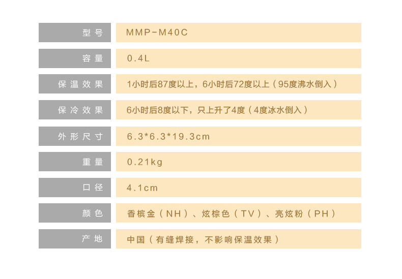 以下是tiger虎牌保温杯女士男士MMP-M40C轻便304不锈钢杯水杯子400ML的详细说明,厂家介绍,求购联系信息,最终解释权归上海虎生电子电器有限公司所有