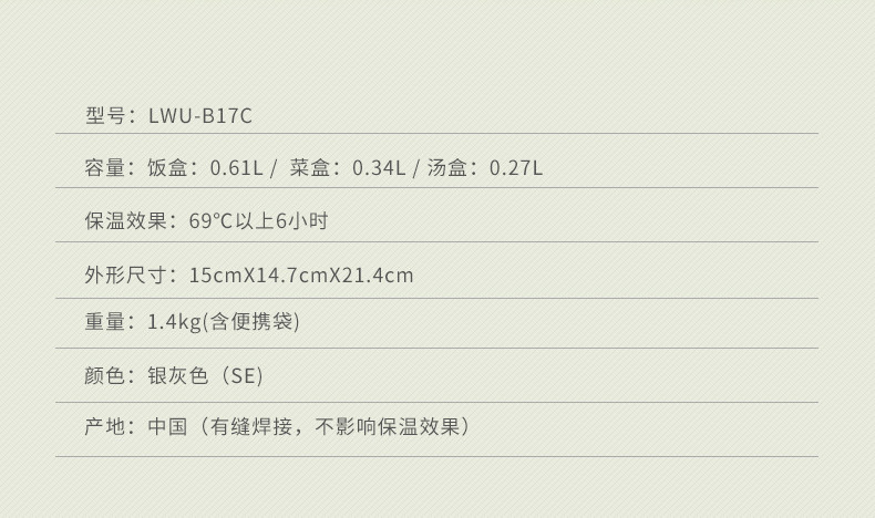以下是tiger虎牌304不锈钢保温桶午餐便当盒LWU-B17C附便携袋学生饭盒的详细说明,厂家介绍,求购联系信息,最终解释权归上海虎生电子电器有限公司所有