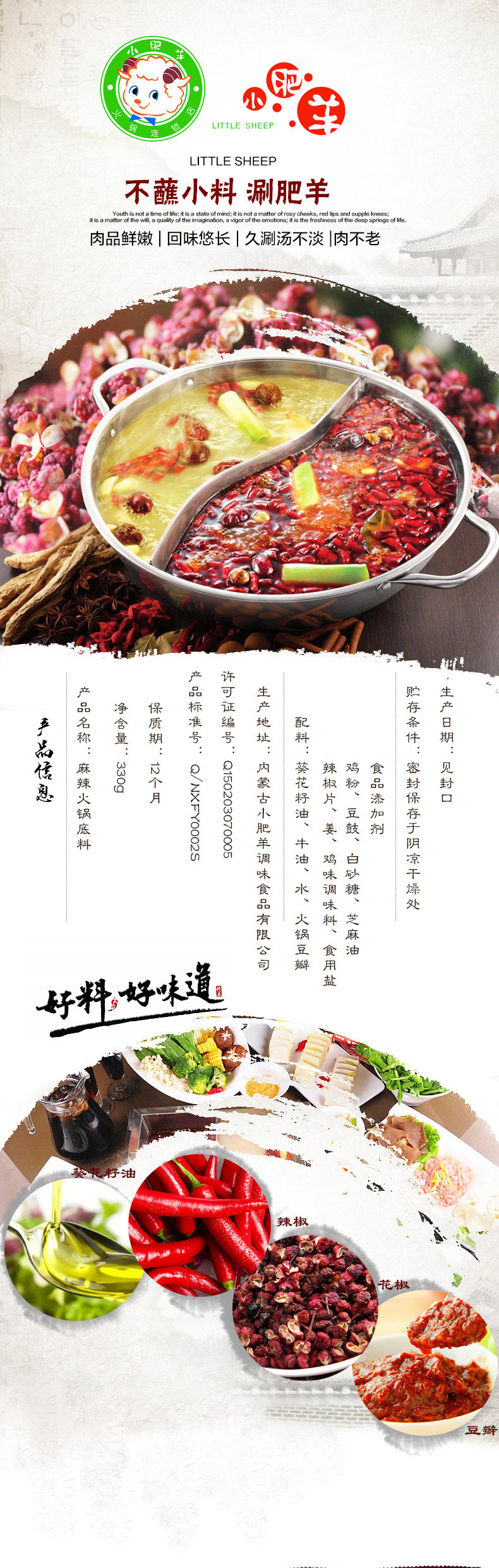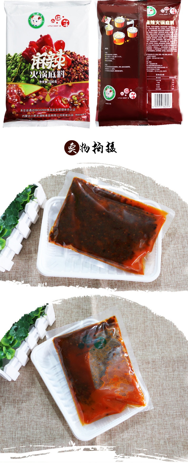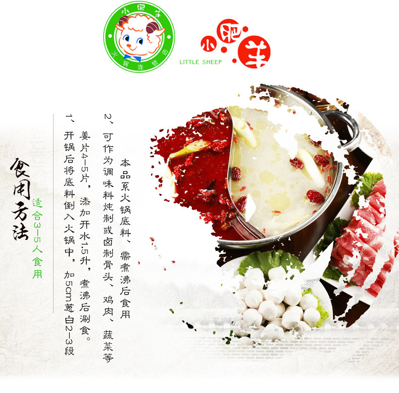 以下是1包包邮 满2包送蘸料 小肥羊麻辣火锅底料 330g涮火锅调味料香锅的详细说明,厂家介绍,求购联系信息,最终解释权归百胜(中国)投资有限公司所有