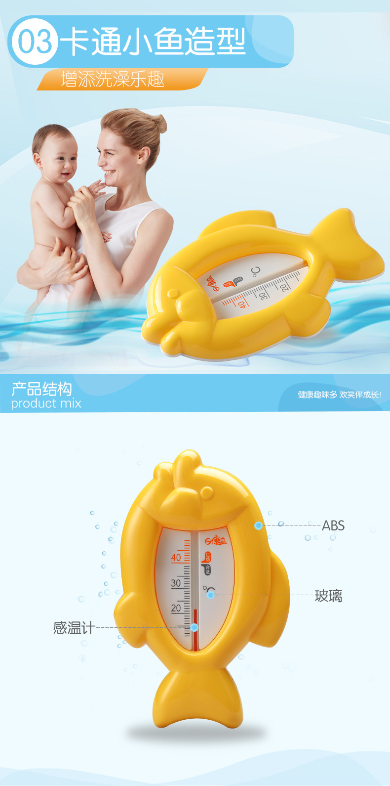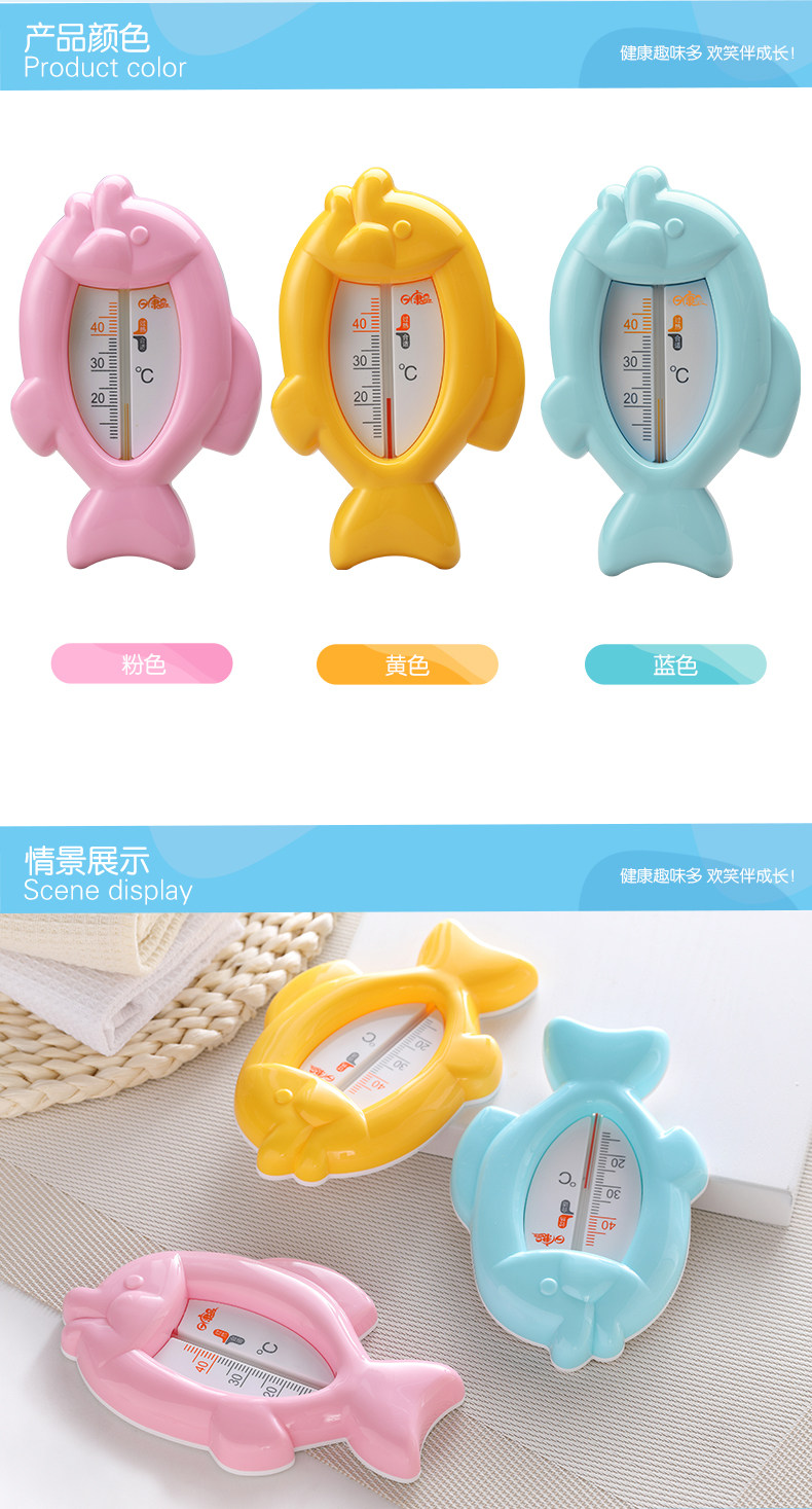 小鱼水温计可用于宝宝沐浴前测量水温,也可用于平时测量室温。将小鱼水温计放置于水中2-3分钟取出便可查看水温,使用后请擦干水分。测量室温放在室内即可。沐浴时先放冷水,后加热水,充分搅拌均匀后再放温度计测量水温。