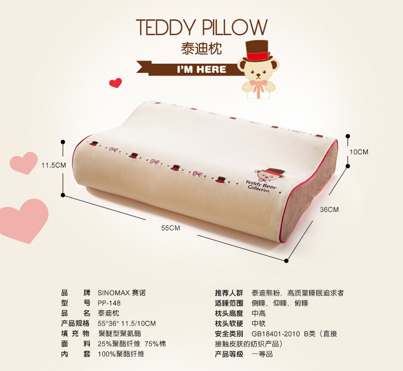 SINOMAX赛诺正版泰迪熊卡通慢回弹记忆棉枕头枕芯专柜同款成人枕