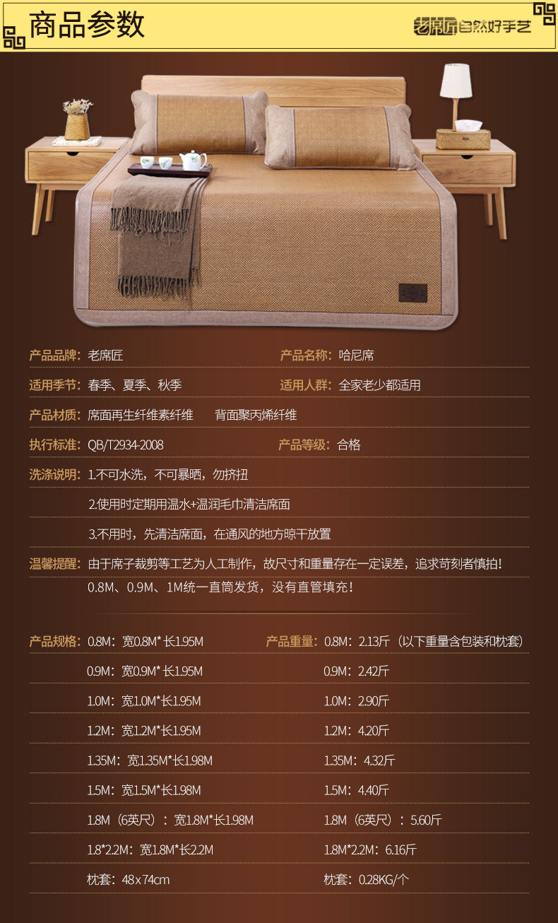老席匠凉席1.8m床三件套竹加厚藤席折叠席子1.2空调单人夏季1.5米