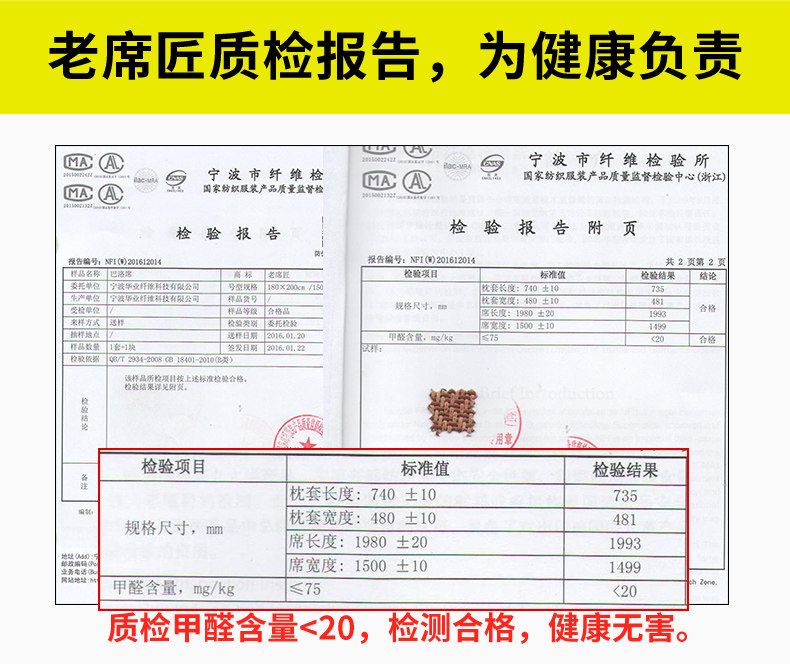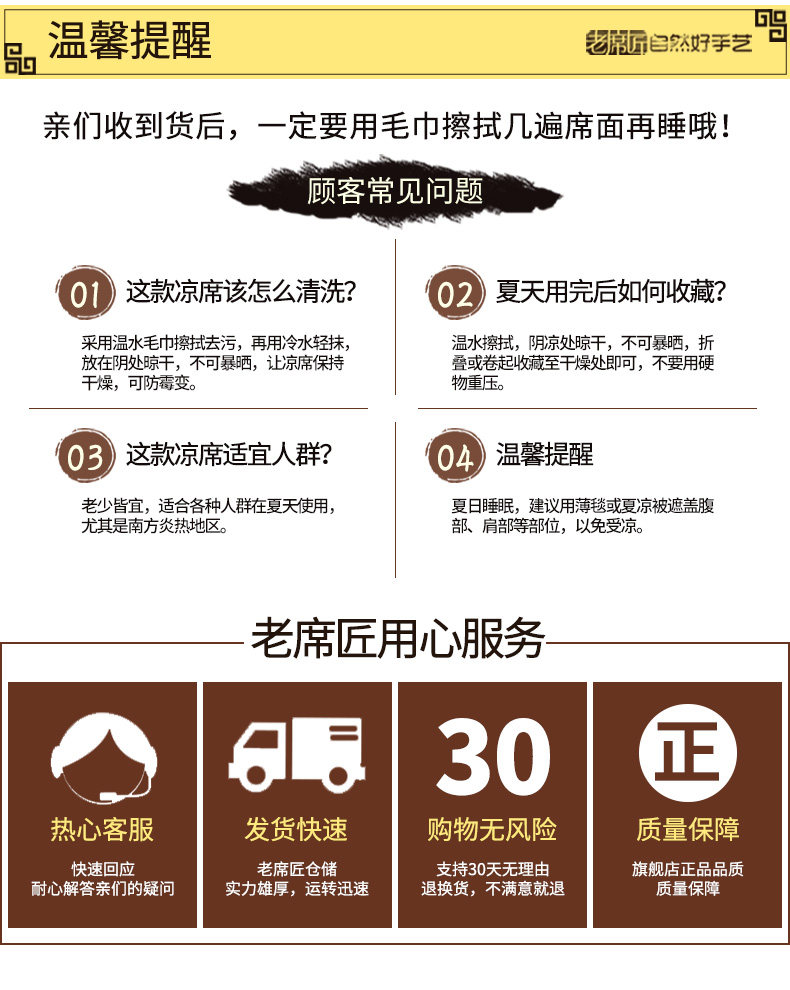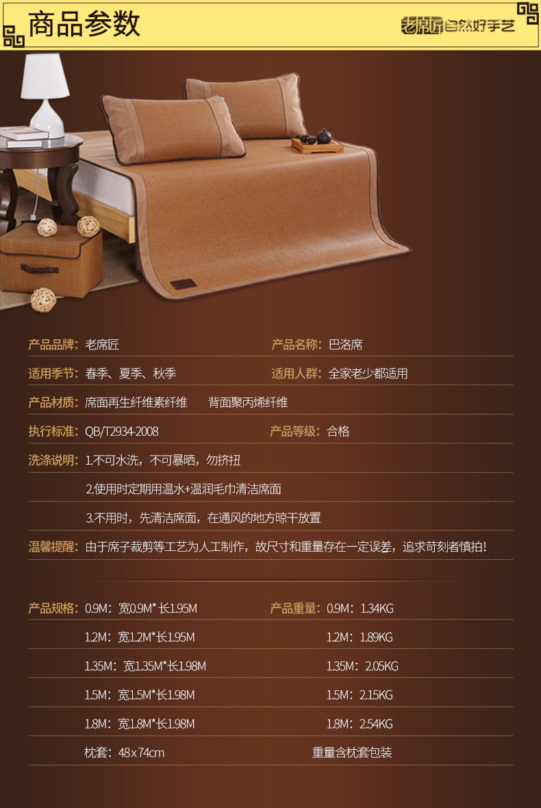老席匠凉席 碳化席子折叠双面竹席三件套1.8m天然竹凉席1.5米