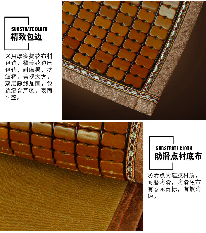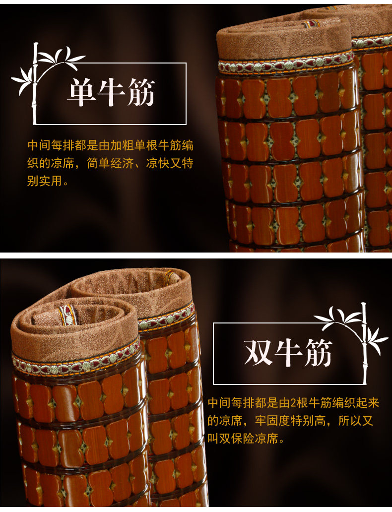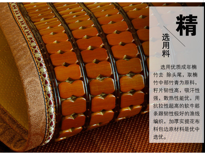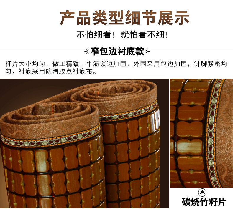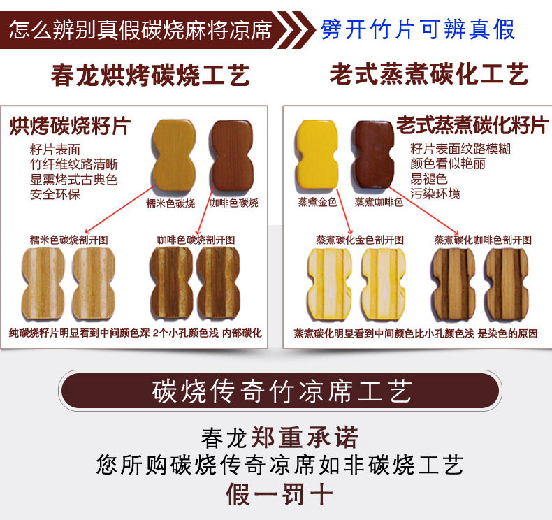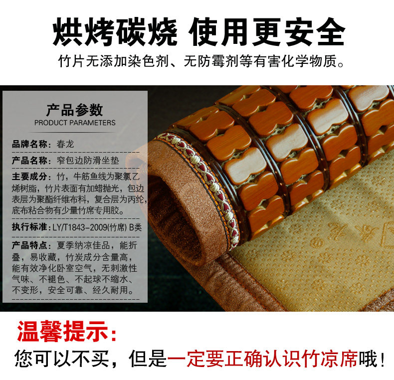 (春龙追求的是产品回归自然,尽量争取更加绿色、健康安全、环保!竹片完全由高温烘烤碳化,凉席由许多竹子加工而成,有可能有少许色差,但是随着使用时间的加长,颜色会变的更加均匀好看)。