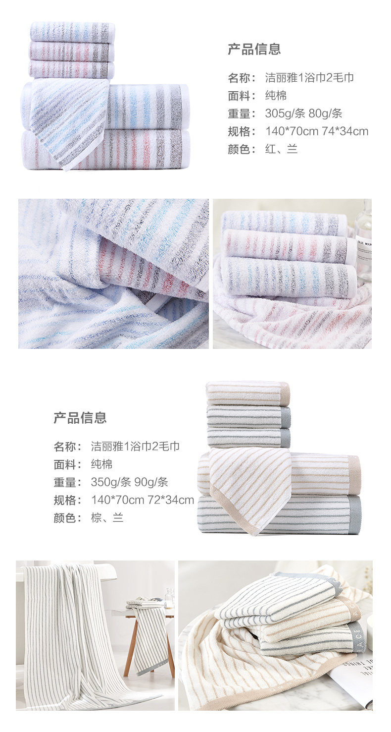 洁丽雅纱布浴巾三套装 搭配精美礼盒舒适亲肤吸水细格子条纹