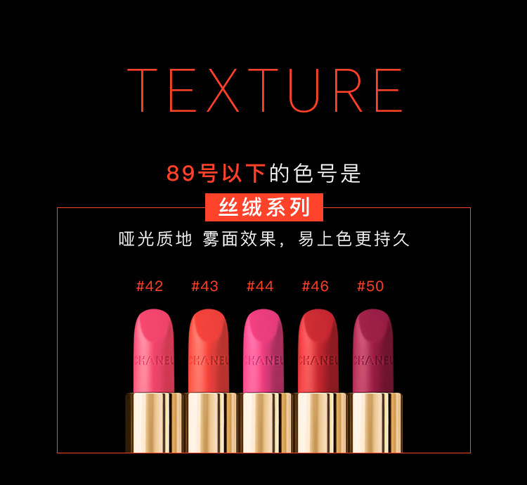 | 基本属性: | 本款唇膏分两种,丝绒系列为哑光唇膏,炫亮系列略亮泽一些,带微细闪粉效果。 |