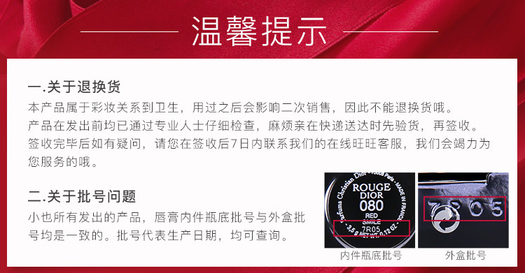 | 温馨提示: | 1.唇膏管身是按压弹出设计,小也会为您精心包装,但运输过程中难免会有碰撞会导致管身弹出、盒盖被挤开,但不会影响唇膏的完整性和品质,亲们介意勿拍哦!感谢亲的理解! 2.产品不同批次略有不同,品质相同,亲们介意勿拍哦! 3.唇膏里的油脂成分在温度高时会渗出,温度降低时会回到膏体中,并在唇膏表面留下痕迹,俗称“出汗”或“挂珠”,并不影响唇膏正常使用哦! 4、丝绒系列只是色号不同哈,持久度和滋润度都是一样的呦~各位MM可以选择想要尝试的颜色呦~ |