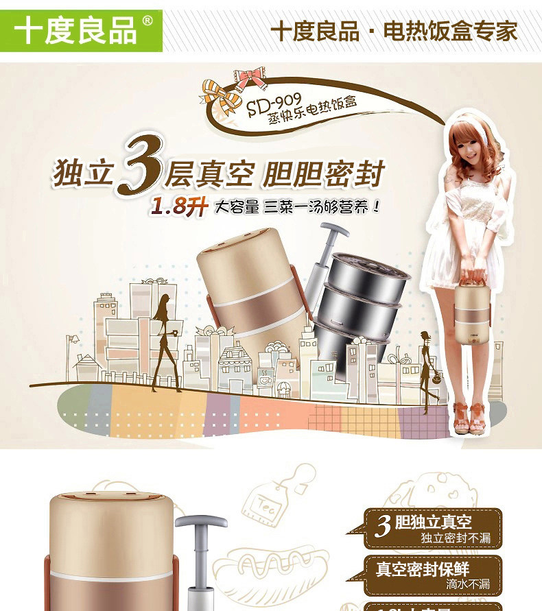十度良品电热饭盒SD-909可插电保温加热饭盒不锈钢三层蒸饭电饭盒