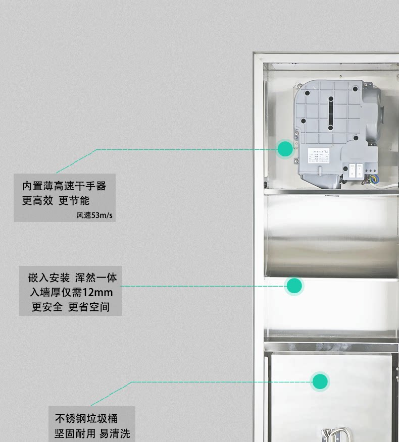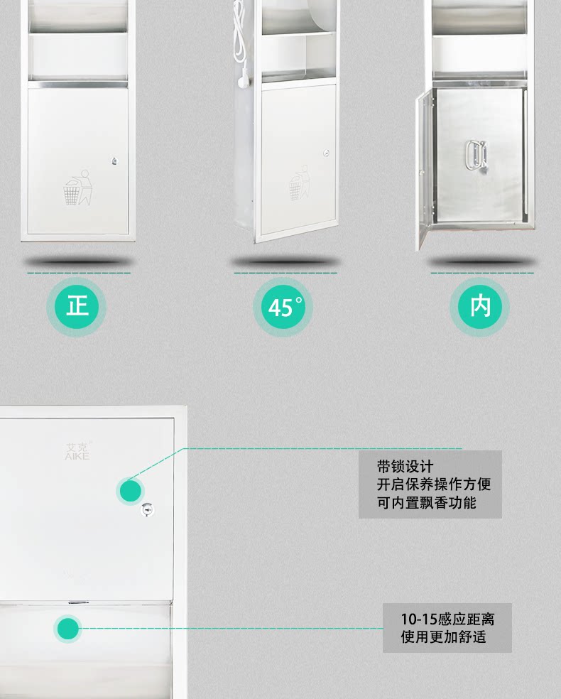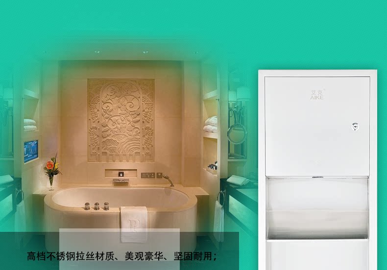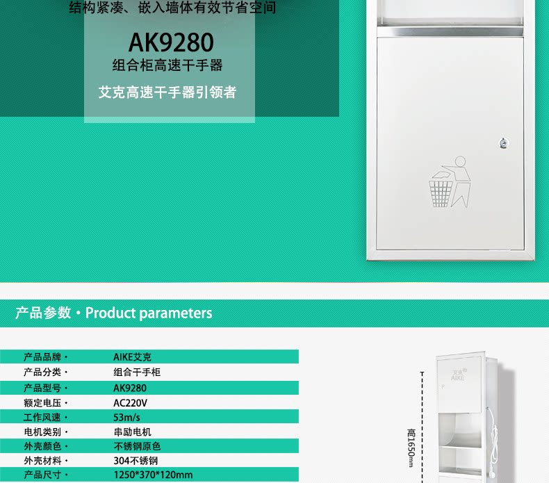 艾克AIKE干手器组合柜不锈钢嵌墙式垃圾桶纸巾盒三合一商用组合柜