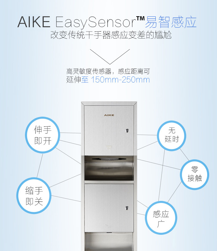 艾克AIKE干手器组合柜不锈钢嵌墙式垃圾桶纸巾盒三合一商用组合柜