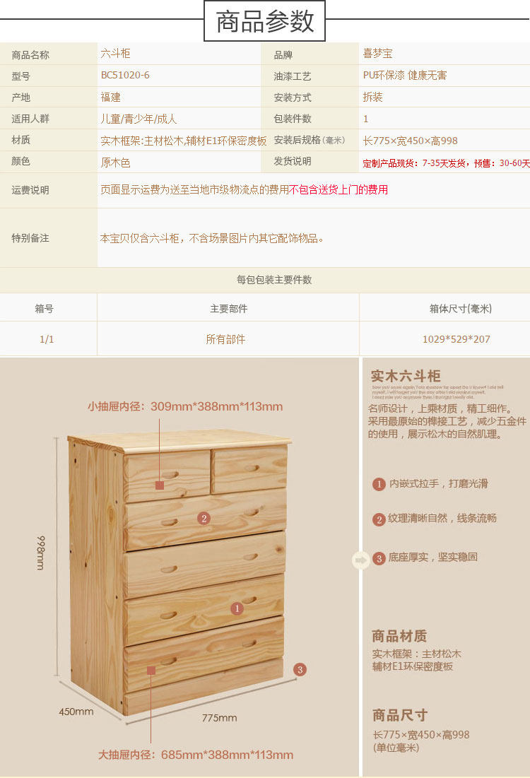 喜梦宝实木都市木歌斗柜松木六斗柜收纳柜储物柜松木抽屉柜置物柜