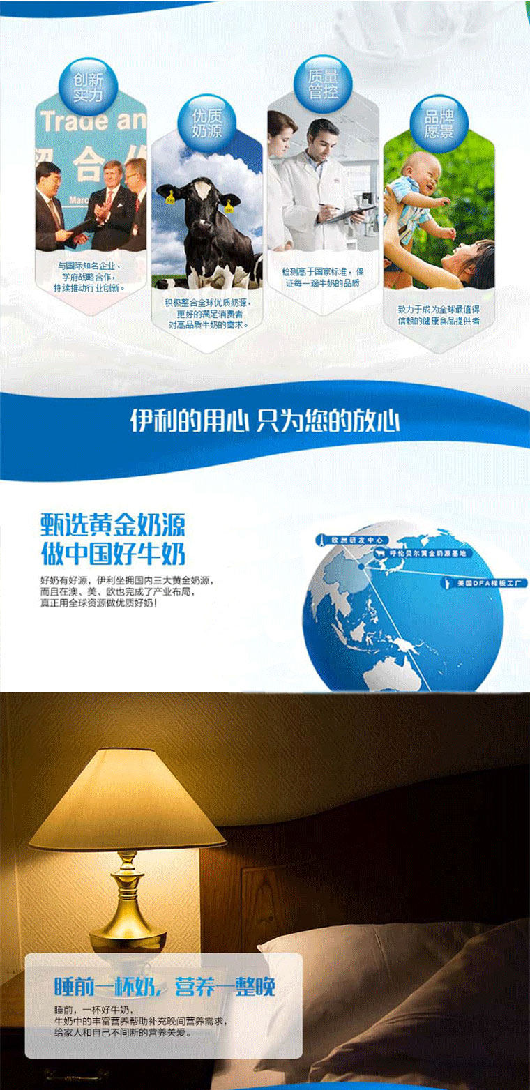 始于1993年,拥有国内规模较大的优质奶源基地,由液态奶、冷饮、奶粉、酸奶和原奶五大事业部组成,旗下有金典SATINE、安慕希AMBROSIA、QQ星、舒华SHUHUA、谷粒多等知名产品 伊利将品质视为生命,致力于生产100%安全、100%健康的乳制品,将质量管理工作战略升级为“质量领先3210战略”,聚焦“全球最优品质”,持续升级全球质量管理体系,将严苛的质量管控标准贯穿于全球产业链,保证零食品安全事件。 一方面,伊利积极对标国际,与SGS(瑞士通用公证行)、LRQA(英国劳氏质量认证有限公司)和Intertek(英国天祥集团)达成战略合作,持续升级伊利全球质量安全管理体系,强化食品质量安全风险控制的能力。同时,伊利利用互联网思维,建立完善的产品追溯程序。奶源基地从奶牛出生即为其建立养殖档案,原奶运输过程实现全程可视化GPS跟踪,原奶入厂后采用条码扫描,随机编号检测;同时,建立了生产过程的产品批次信息跟踪表、关键环节的电子信息记录系统、质量管理信息的综合集成系统和覆盖全国的ERP网络系统,实现了产品信息可追溯的全面化、及时化和信息化,并且与国家平台进行对接。 另一方面,伊利是唯一一家掌控西北、内蒙古和东北等三大黄金奶源基地的乳品企业,拥有中国规模最大的优质奶源基地,以及众多的优质牧场,为原奶长期稳定的质量和产量提供了强有力保障。同时,伊利还在欧洲、大洋洲、美洲等积极整合全球优质奶源资源,更好地满足消费者对高品质乳品的需求。截至2016年底,伊利共投入约135亿元用于奶源升级与建设。2016年,伊利在全国拥有自建、在建及合作牧场2400多座,规模化集约化的养殖在奶源供应比例达到100%,居行业首位。 全球,有容乃大 国际化是伊利集团的重要战略。目前,伊利在亚洲、欧洲、美洲、大洋洲等乳业发达地区构建了一张覆盖全球资源体系、全球创新体系、全球市场体系的骨干大网。在欧洲,结盟意大利乳业巨头斯嘉达;此外,在荷兰成立海外研发中心——欧洲研发中心;在大洋洲,投入30亿元在新西兰建设一体化乳业基地;在美洲,主导实施全球农业食品领域高端智慧集群——中美食品智慧谷。该智慧谷集聚整合了众多全美顶尖的常青藤联盟名校、全球综合排名前十的大学及在农业、管理、生命科学等各个领域全球排名第一的高校、科研院所和机构,如宾夕法尼亚大学、康奈尔大学、耶鲁大学、多伦多大学、加州大学戴维斯分校、沃顿商学院、明尼苏达大学等,在“营养健康、产品研发、食品安全、农业科技、畜牧兽医、生态环保、企业管理、人才培养”等多个领域展开全方位立体式合作,形成中美乃至全球在农业食品方面“集聚院校机构最多实力最强、涉及领域最广最前沿、模式最独创机制最灵活、影响最深远受益面最大”的高端、超前智慧集群,共同为中美创新合作形成新引擎、注入新动能、树立新典范,从而更好地推动两国企业互惠发展、真正造福两国人民。 创新,改变未来 伊利一直坚持和推动创新战略,经过多年发展,已经建立了多个领先的技术研发和产学研合作平台,持续推动行业创新。其中,国家认定企业技术中心、乳品深加工技术国家和地方联合工程研究中心、全国冷冻饮品标准化技术委员会秘书处、国家乳制品加工技术研发专业分中心、国家乳肉检测中心的乳品检测研究室等都属于国家级别的研发创新平台。 当前,伊利紧紧围绕国际乳业研发的重点领域,整合海内外研发资源,从全球视角布设一张涵盖全球领先研发机构的全球创新网络,覆盖亚洲、欧洲、大洋洲和美洲,开展全产业链创新合作,取得了丰硕的实际成效。通过整合全球创新资源,伊利先后研发和推出了安慕希、金典、QQ星、畅意100%、金领冠、畅轻、巧乐兹、伊利牧场以及冰工厂等众多明星品牌,赢得消费者高度信赖。 伊利始终致力于推动中国母乳研究,与专业机构联合创建了“乳业研究院”;携手国内外多方权威营养机构,通过对中国母乳的潜心研究,建立了针对中国人的母乳数据库;创立了“母婴营养研究中心”;发布了《中国母乳研究白皮书》;引领中国乳品行业在针对中国人群特别是中国母婴营养研究工作上进入了系统化、规范化的发展时代。当前,伊利在整合全球优势创新资源,全面升级母乳研究数据库,将母乳研究数据拓展到更加细微的母乳功能成分研究,并且建立更前沿、更准确的母乳成分检测方法,形成具有伊利自主知识产权的母乳科学研究数据。 责任,温暖社会 “厚度优于速度、行业繁荣胜于个体辉煌、社会价值大于商业财富”。伊利以自身的良好经营、与环境的和谐共处、与社会的多方共赢,带动了企业公民理念在中国商界的普及。伊利持续聚焦“青少年、社区、环境”,截止2016年在公益事业上累计投入近8亿元。 伊利联合中国西部人才开发基金会、中国红十字基金会、全国多家媒体、NGO组织等共同推出了关注“儿童成长安全”的教育类品牌公益项目——伊利方舟。四年多来,伊利方舟的航迹已走过全国25个省市地区,开展了70余场儿童安全专项培训,涵盖防拐防走失、防性侵、防震、防火、防溺水、防暴、防踩踏、交通安全、日常生活安全等近20个主题,直接让20余万孩子、老师、家长受益。此外,伊利集团在业内首倡“绿色产业链”,践行与自然、社会、公众、行业合作伙伴的和谐共赢之路,从而形成整个产业