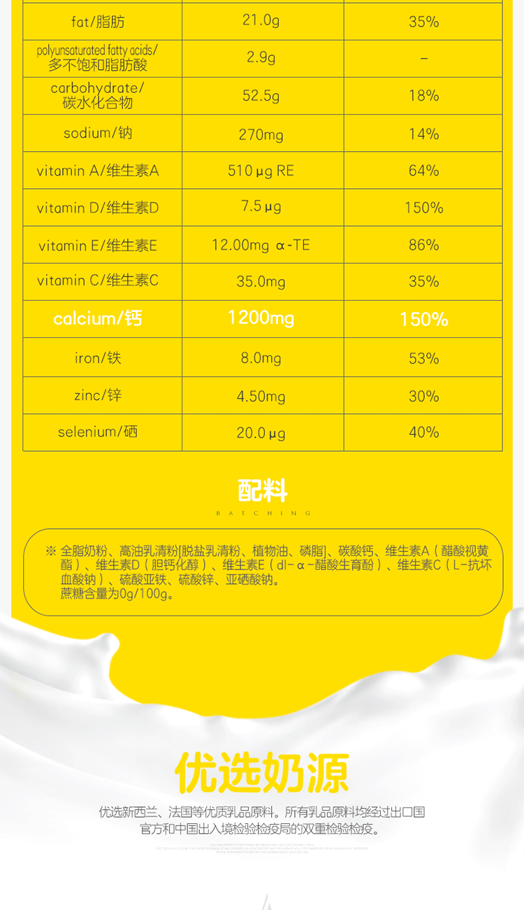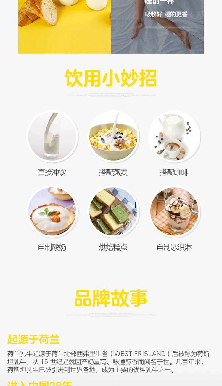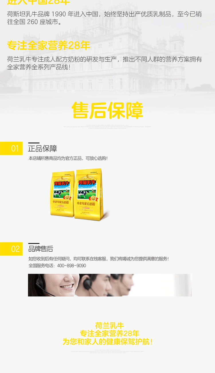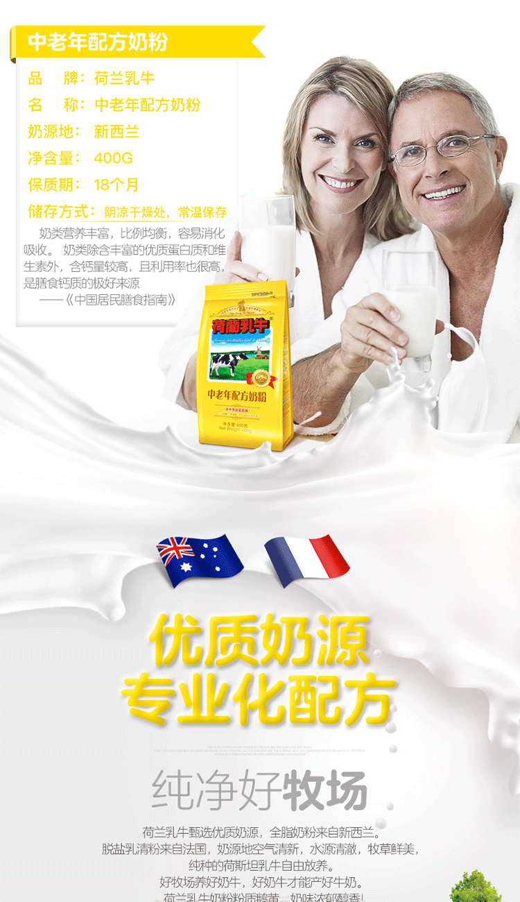 荷兰乳牛是一个历史悠久,文化深厚的知名品牌。多年来一直以“关注健康营养,回报人民社会”为己任,精挑细选优质奶源,保证乳品原料100%进口,奶味醇香,安全放心。产品定位于高端奶粉市场,针对不同人群的精制配方,在充分发挥进口奶源优势的同时,添加针对性的营养物质,以满足不同人群的营养需求,更专业,更多营养。悠久的品牌历史,成为消费者心中信得过的产品。