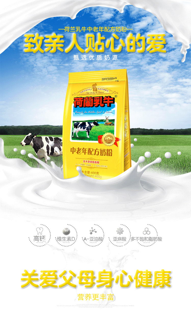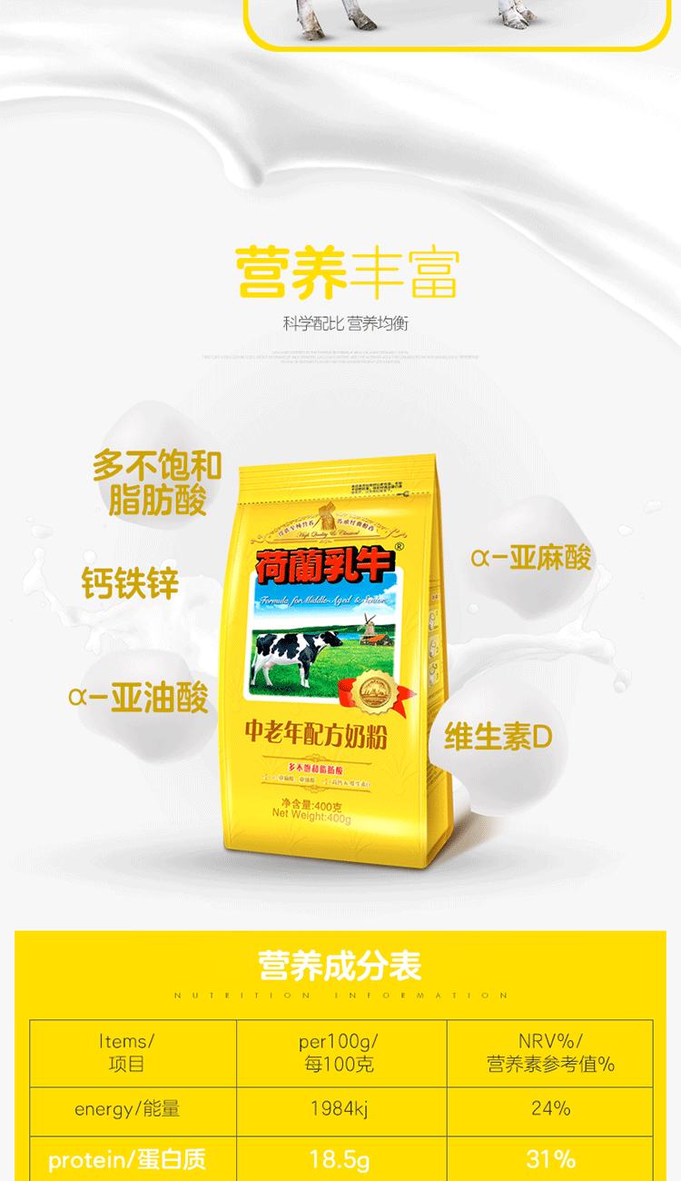 圣元营养食品有限公司,荷兰乳牛,于1990年进入中国,中老年奶粉十大品牌,定位于高端奶粉市场,专注于健康营养食品的专业奶粉品牌