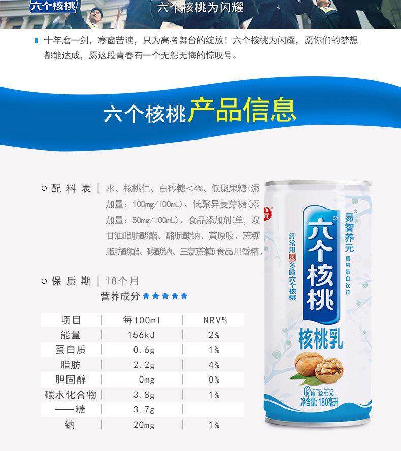 易智养元六个核桃低糖型180ml*20罐植物蛋白饮料核桃乳饮品礼盒装