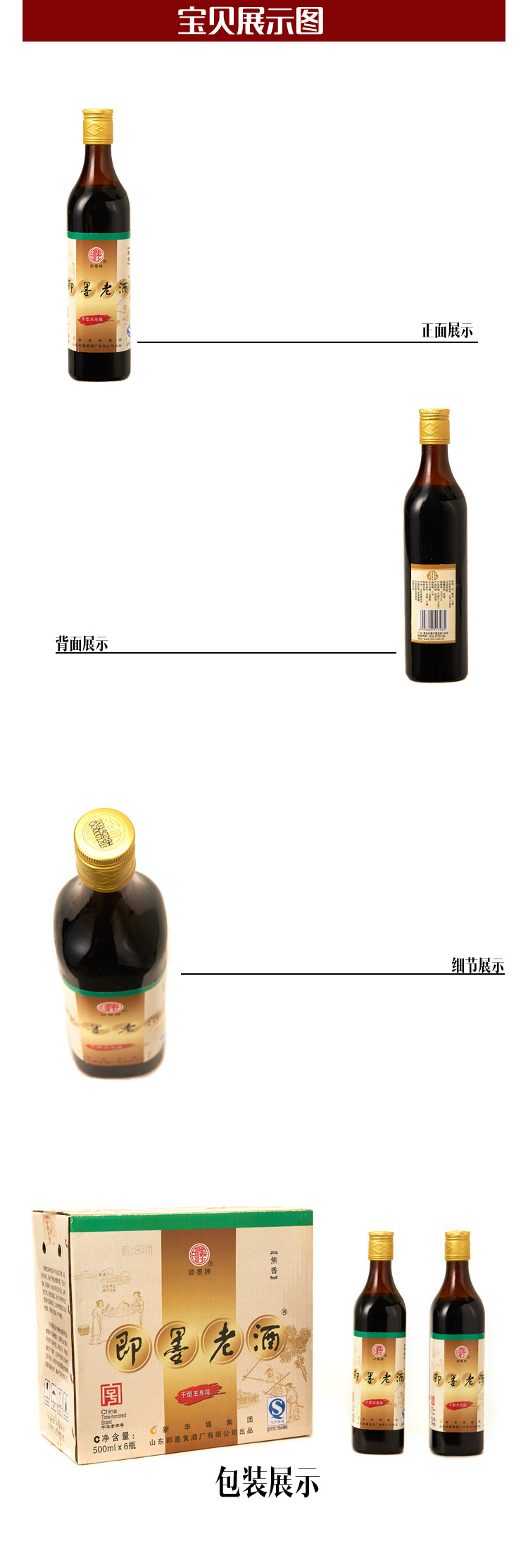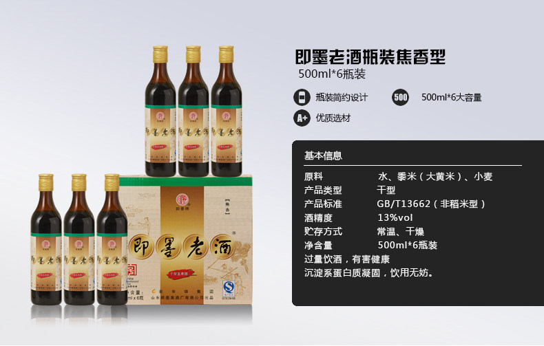 即墨老酒干型低聚糖黄酒五年陈酿500mlx6瓶整箱黄酒包邮