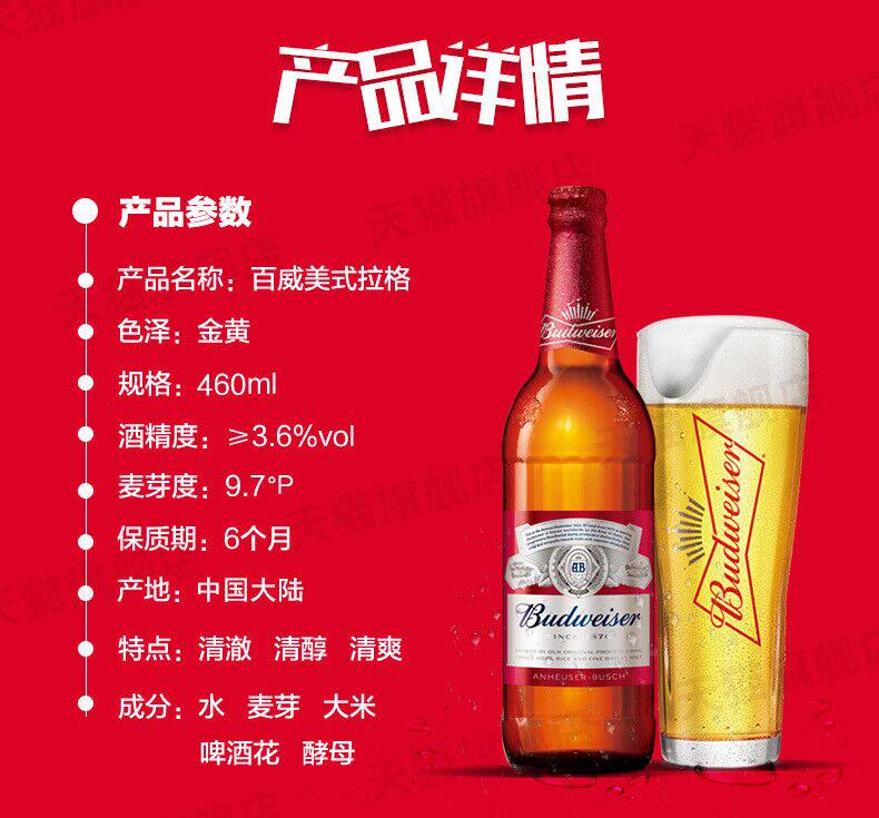 Budweiser/百威啤酒美式拉格460ml*12瓶装大瓶装小麦整箱促销