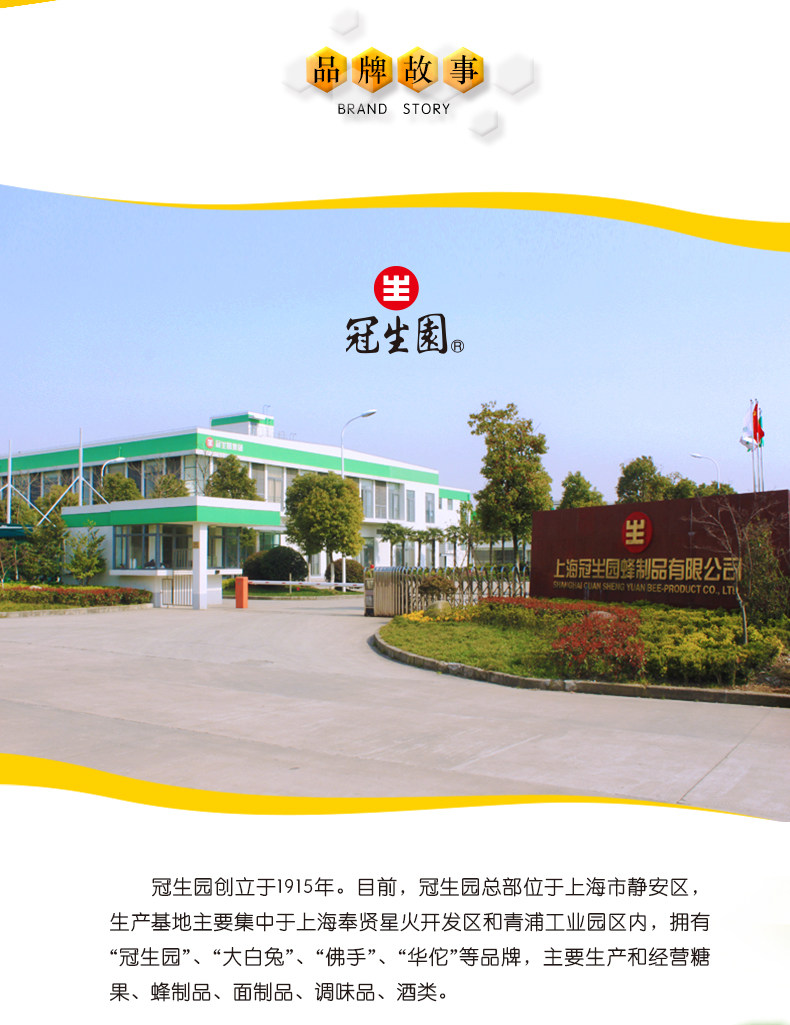 冠生园(集团)有限公司,冠生园蜂制品,始于于1956年,冠生园旗下较具代表性产品,以精选天然成熟蜂蜜经五层过滤精制而成,专注于蜂制品的研发、生产、销售的现代化企业 “冠生园”蜂制品是“冠生园”品牌代表性的产品,它由冠生园集团旗下的核心企业——上海冠生园蜂制品有限公司荣誉出品。“冠生园”(原“生”字牌)蜂蜜是1956年公私合营时,吸收了当时的青青蜂蜜厂成立的。“冠生园”蜂蜜历经了半个多世纪的风风雨雨,至今仍充满青春活力。 2005年,冠生园蜂蜜实现销售收入1.5亿元,比上年增长近30%,在全国市场占有率名列第一。在上海的市场占有率更是连续多年保持在50%以上。如果说“冠生园”蜂蜜的成功是冠生园人在质量管理上的成功,那么冠生园最新推出的“鲜皇浆冻干粉”则体现了冠生园人对科技创新孜孜不倦的追求。蜂皇浆是一种珍贵的传统滋补保健佳品,具有美容润肤、调节肠胃、预防癌症、保护肝脏、抗疲劳、延缓衰老、调节血压、健脑益智等功能,一直深受广大消费者喜爱。但由于蜂皇浆在常温下容易变质,给运输和保存带来了困难,造成这种营养保健价值极高的天然保健品在国内没有得到应有的认识和利用。冠生园利用先进的冷冻干燥技术(在低于零下20摄氏度的低温条件下,将蜂皇浆冻干后再研磨成粉。由于整个加工过程在极低的温度条件下进行,且不添加任何食品添加剂,所以最大限度地保留了鲜皇浆的有效营养成分)将鲜皇浆制成冻干粉胶囊,克服了鲜蜂皇浆需要在冷冻条件下保存的缺点,而且使用起来更加方便,还避免了直接食用时蜂皇浆特有的酸、辛、涩等不良口感。 在公司的“十一五”规划中,公司决策层已确立了将“冠生园”从中国蜂蜜第一品牌打造成为中国蜂制品第一品牌的宏伟目标。为此我们将继续加大新产品研发和市场开发的力度,“冠生园”蜂胶软胶囊正在向国家食品药品监督管理局(FDA)申请保健品批号,很快就会和广大消费者见面。蜂花粉的深加工利用技术也在加紧研究,“冠生园”蜂制品倡导一种绿色、自然、健康的生活方式,它采用货真价实的天然原料,将传统养生之道与现代高科技相结合,带给消费者健康和幸福。