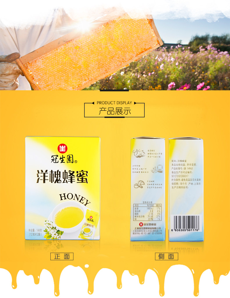 以下是包邮 冠生园 便携12袋装洋槐蜂蜜3盒量贩装 农家自产原材的详细说明,厂家介绍,求购联系信息,最终解释权归冠生园(集团)有限公司所有