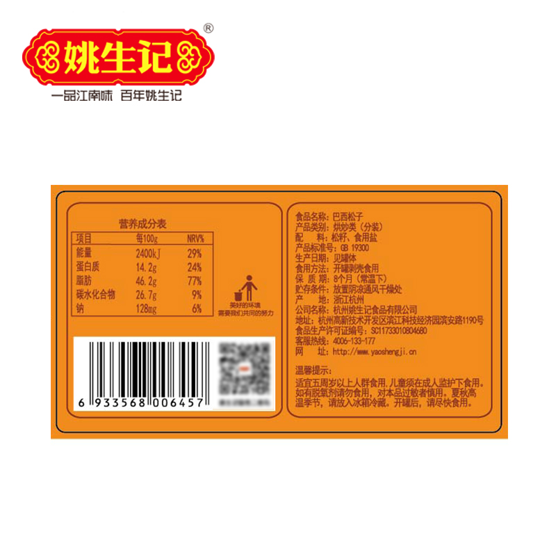 以下是【姚生记薄壳手剥松子 128g罐装】坚果炒货特产零食巴 西松子新货的详细说明,厂家介绍,求购联系信息,最终解释权归杭州姚生记食品有限公司所有