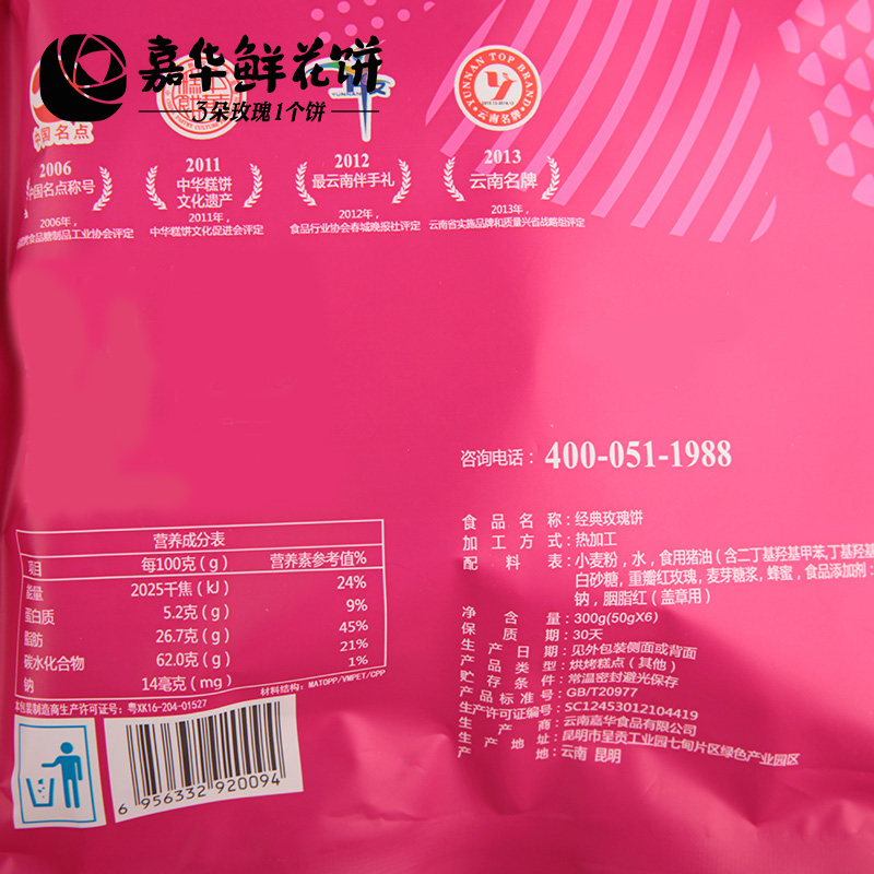 以下是嘉华鲜花饼 经典玫瑰花饼6枚礼袋*2云南特产零食小吃传统糕点饼干的详细说明,厂家介绍,求购联系信息,最终解释权归云南嘉华食品有限公司所有